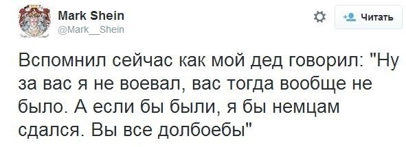 В общем, не вешайте на людей ярлыки и не приписывайте им ничего из того, что не знаете наверняка, пожалуйста. И конечно же: С ПРАЗДНИКОМ ПОБЕДЫ В ВЕЛИКОЙ ОТЕЧЕСТВЕННОЙ ВОЙНЕ ВАС И ВСЕХ ЧИТАЮЩИХ!!!