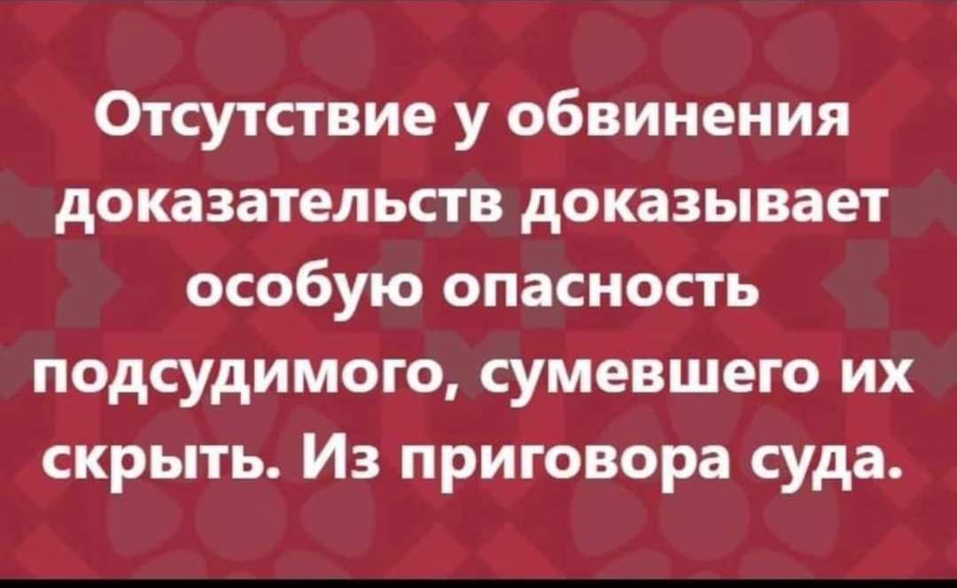 1 megr79 Юмор Отсутствие у обвинения доказательств - доказывает особую опасность подсудимого 2 года назад Юмор Суд Жизнь 2 1 1 Ещё 0