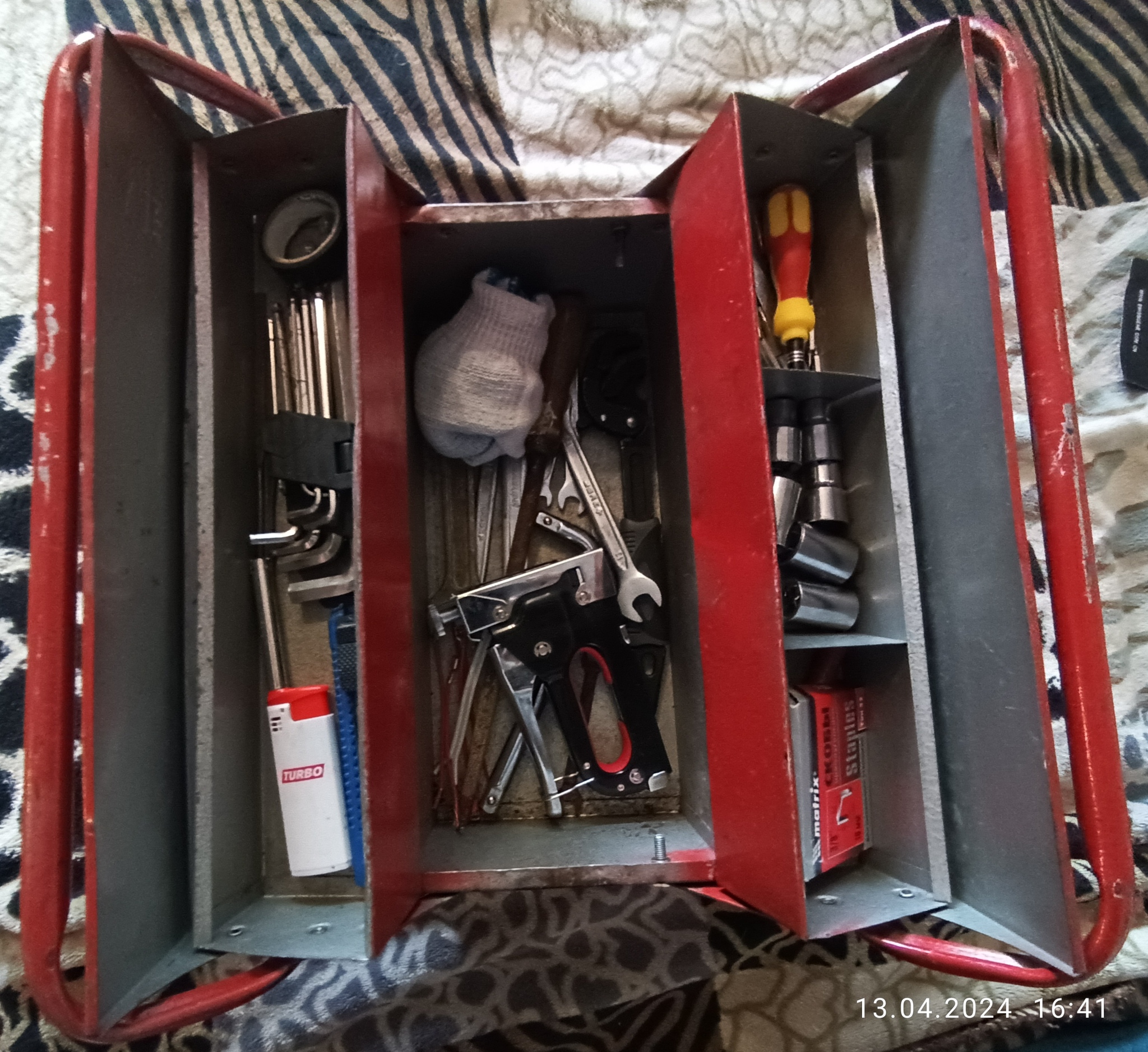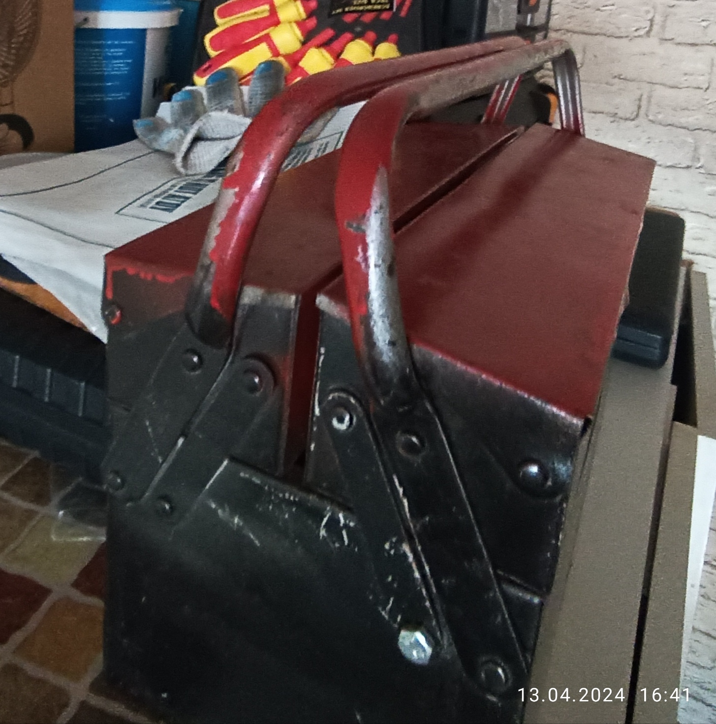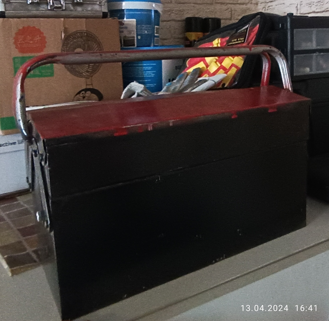 Он был мятым, одна направляйка сломана, да и внутри одни саморезы болты и пыль наверно с времён СССР. Решил его починить. Сам ящик явно из алюминия. Высопал все что было внутри, перебрал оставил нужное и то переложил в обычную коробку. Сам ящик отмыл, выровнял, починил направляйку обычными болтами и покрасил внешнию часть. У меня самого хранился инструмент в современном фикспрайсовском пластмассовом ящике. Вот разложил инструмент. И как то гармонично стало. Думаю со времени и внутреннюю часть тоже покрасить.
