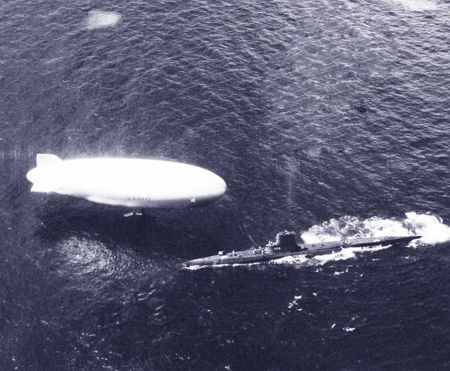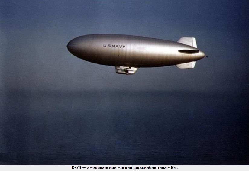 Именно такую задачу летом 1943 года выполнял у берегов Флориды американский дирижабль. K-74 — мягкий дирижабль типа «К». Эти воздушные корабли не имели металлического каркаса и состояли из мягкой оболочки длиной 76,5 метра и диаметром 17,6 метра и подвешенной под оболочкой гондолы. K-74 имел на борту радиостанцию, РЛС, магнитометр и гидроакустические буи, а также 12,7-мм пулемёт M2 Browning и глубинные бомбы двойного назначения Mark 17 (с ударным и глубинным взрывателями).