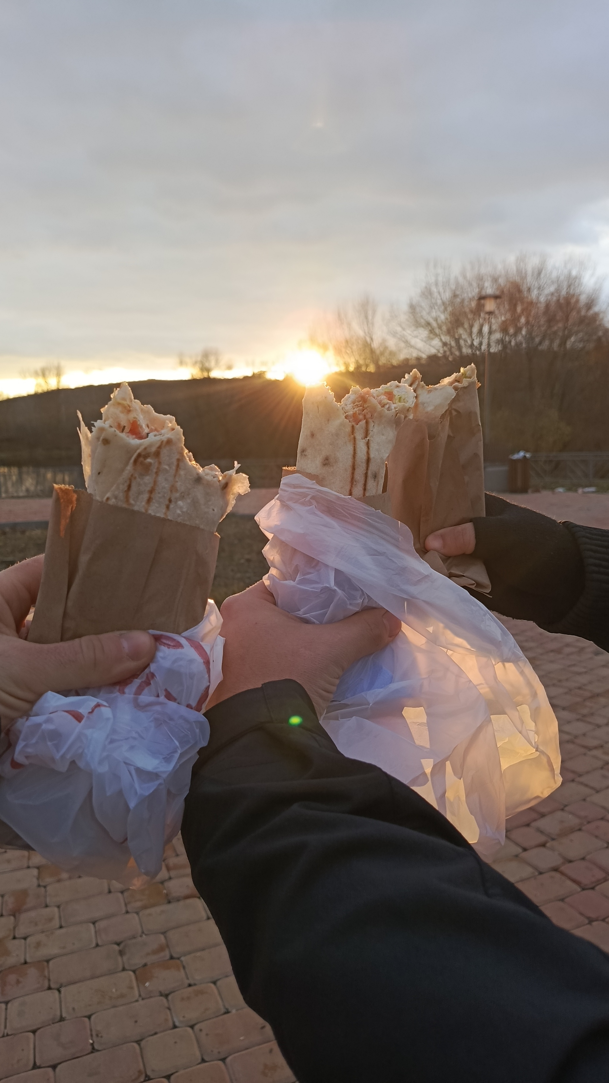 Я, сижу в парке, на берегу реки смотрю на закат, а в руках шаурма с мясом на углях. С добавкой из чипсов!