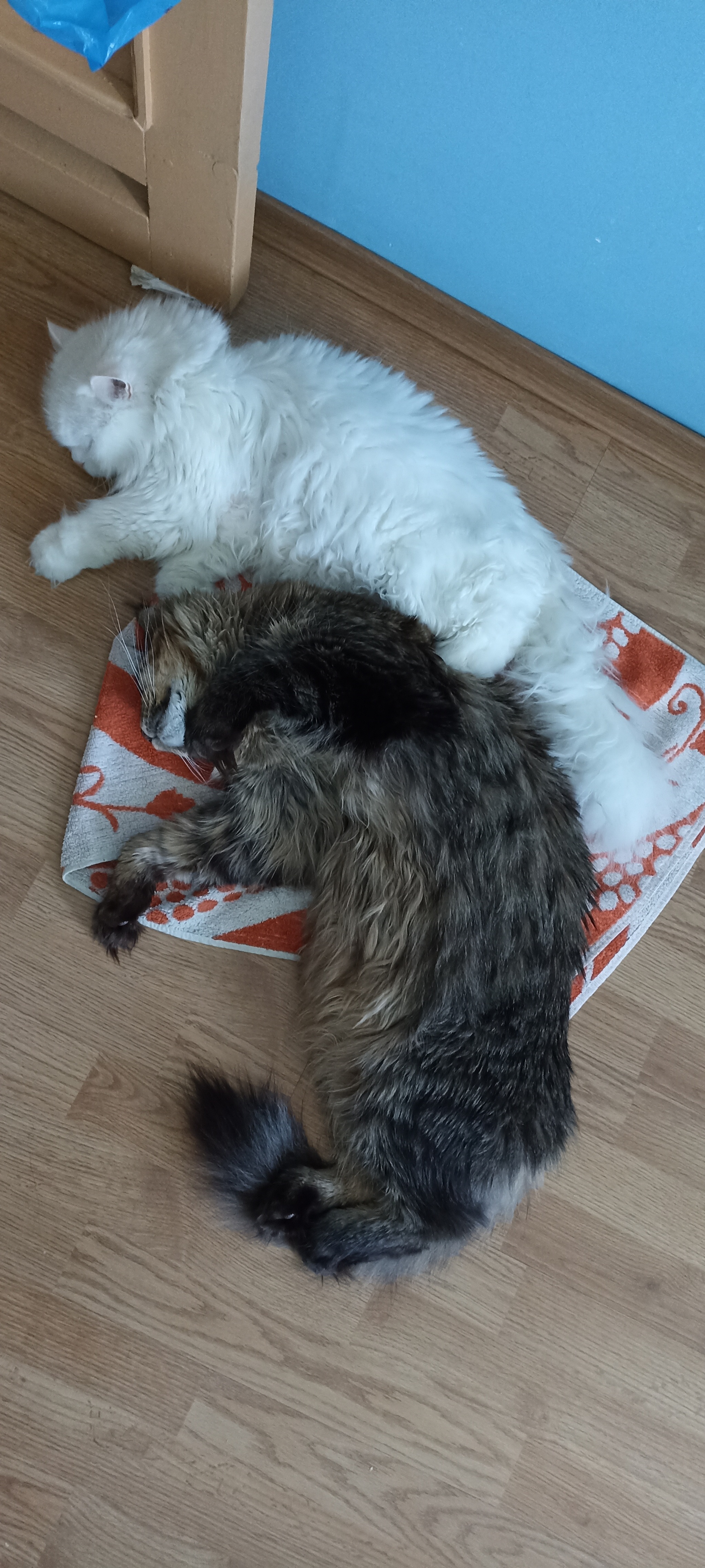 Вот котаны. Белый старикашка (16 лет) с какашкой справиться не смог, оставил коричневые следы по квартире, ну и в лежанке от души полежал. Пока лежанка стиралась, полотенце им кинула, ничё так, даже задумалась, нахрена лежанки покупала.