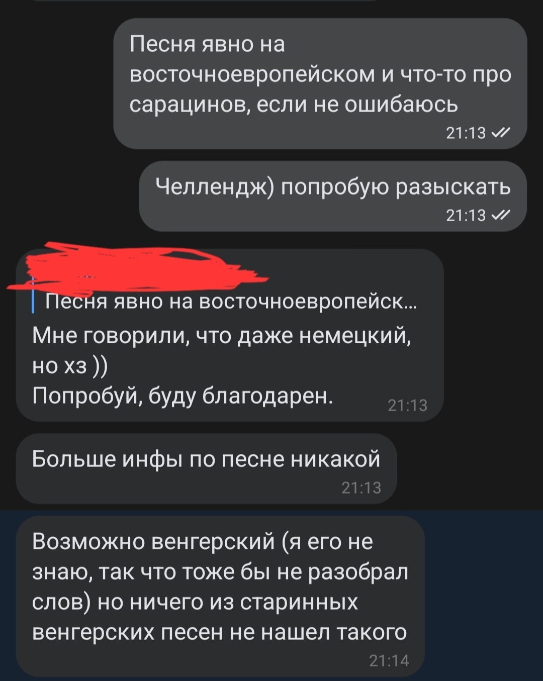 Я решила искать) догадались, что язык венгерский. Начала искать в вк венгерские военные песни. Не сразу, но нашла аж целую группу, где их было много. Слушаю одну за другой, похожих нет. Пытаюсь написать хозяину группы - сообщения закрыты ( ищу в группе тему, где он что-то писал, пишу ему ответ с просьбой послушать песню и подсказать, что это такое. Немного погодя он мне отвечает. Я в шоке от того, насколько человек в теме!