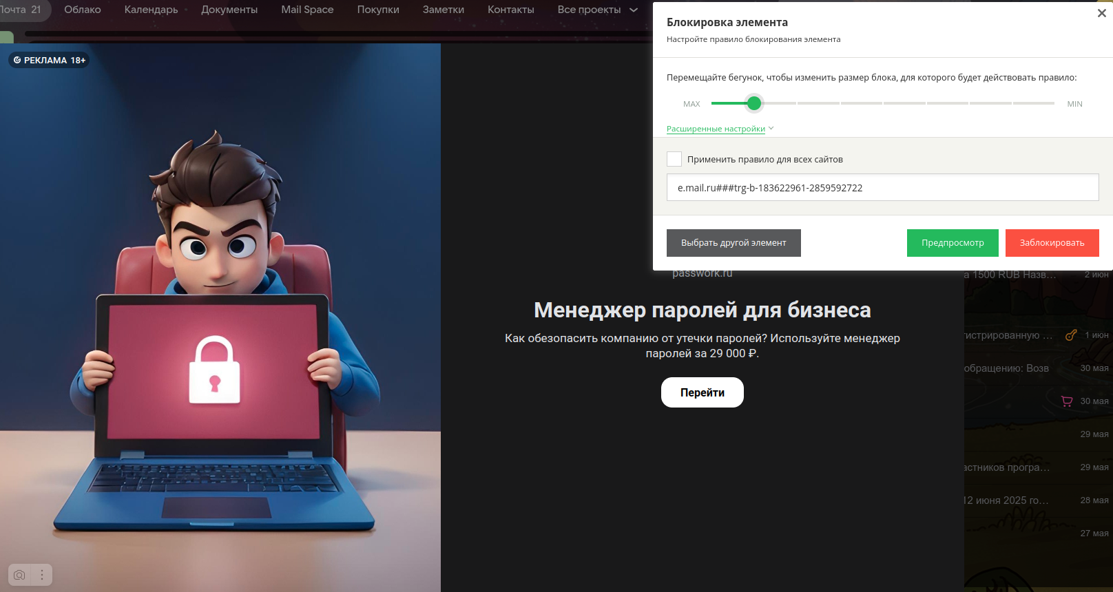 Но в майлру пошли ублюдским путем. Когда пытаешься задать правило блокировки для баннера с рекламой, он каждый раз получает уникальный ID. Т.е. цифры после "e.mail.ru###trg-b-..." каждый раз новые, поэтому блокировщик не спасает. Теперь баннеры появляются после каждого обновления страницы.