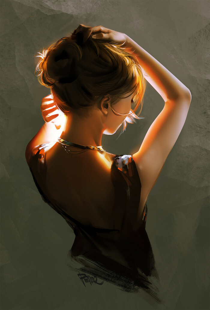 *3апускает пальцы в манящий загривок и слегка тянет волосы вниз, немного приподнимая её голову вверх что бы поближе рассмотреть полуприкрытые глаза с длинными ресницами, аккуратный носик и пухлые губы. Взгляд скользит по подбородку к шее и заканчивает свой вояж на чётко очерченных ключицах.