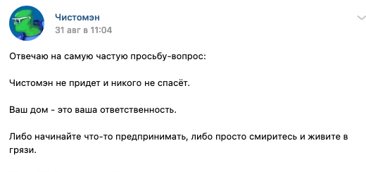 давайте я еще раз попробую вам объяснит, но скорее всего вы опять не услышите: чистомен в основном все свои акции проводит в одиночку (не так ли @chistomen ?). Уверен, что выкладывает посты тут и вк он больше ради собственного пиара и сбора денег о чем можно прочесть на третий строчки его группы. Все его акции это еще один повод написать пост в вк или тут. Как-то развивать движение чистомена автор постов не хочет, массовые субботники он не проводит, но при этом чуть ли не каждую неделю отчитывается, как он собрал мусор в пакеты (хотя я по моему не видел, видео, где он этот мусор собирает). Точно так же убирают мусор тысячи людей по всему миру, но не многие из них пытаются на этом сделать имя и собрав бумажки не бегут рассказать всем какой он молодец и какие свиньи его окружают. По моему мнению чистомен в большей степени бесполезен, я бы его сравнил с Гретой Турнберг: крика много, а реальных дел мало. Погодите дайте время и чистомену так же будут платить гранты, как и "льву против" или "стоп хам". Это будет одно из подобных бесполезных движений ради шумихи и денег.