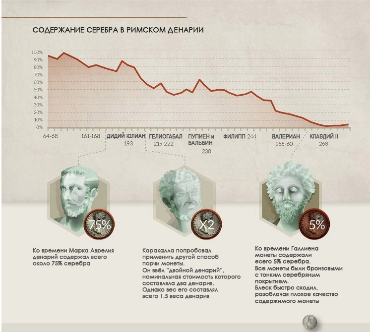 Т.е. во время правления Северов если и было снижение собираемости налогов, то правительство предпринимало усилия по его компенсации за счет роста ставок налогов. В то же самое время в 2-3 раза выросли траты на армию, и для покрытия возникшего разрыва начали активно снижать долю серебра в монетах. Это, естественно, не сделало экономику здоровее, но и к обвалу экономики не привело: инфляция в этот период если и выросла, то незначительно – едва ли превышая 2%, что считается довольно умеренным (см. все ту же статью Продромидиса). Да и какими бы ****** не были наследники Септимия Севера, в кризис Империя все же погрузилась все же не совсем из-за порчи монеты, хотя она и стала предпосылкой.