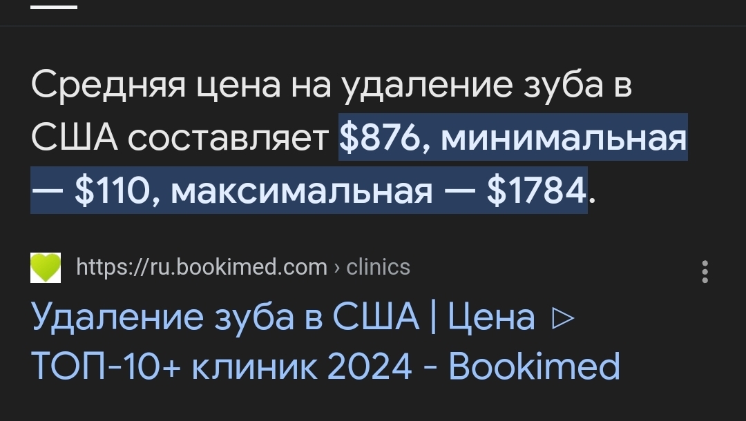53 klichok 1 год назад Ответ Doodlerdan в «Сколько молока можно купить в разных странах?»5 Да что же вы всё про молоко, яйца, машины. Почему никто не сравнивает медицину? Например удаление зуба мудрости в США в 10 - 15 раз дороже чем у нас, посему сюда никто не копает? Цены Рост цен Инфляция Продукты Рубль Текст Ответ на пост 7 2 1 Ещё 0
