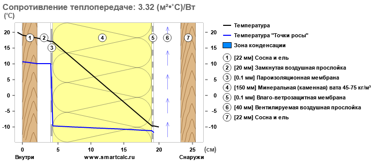 Теперь то же самое для каркасного дома сравнимой теплопроводности. Ну, чуть больше, но это совсем стоковый вариант - каркас в плёнках и 150 мм утеплителя между стоек. В том смысле, что подогнать теплопроводность под стену автора я не могу технически, из-за толщины утеплителя: