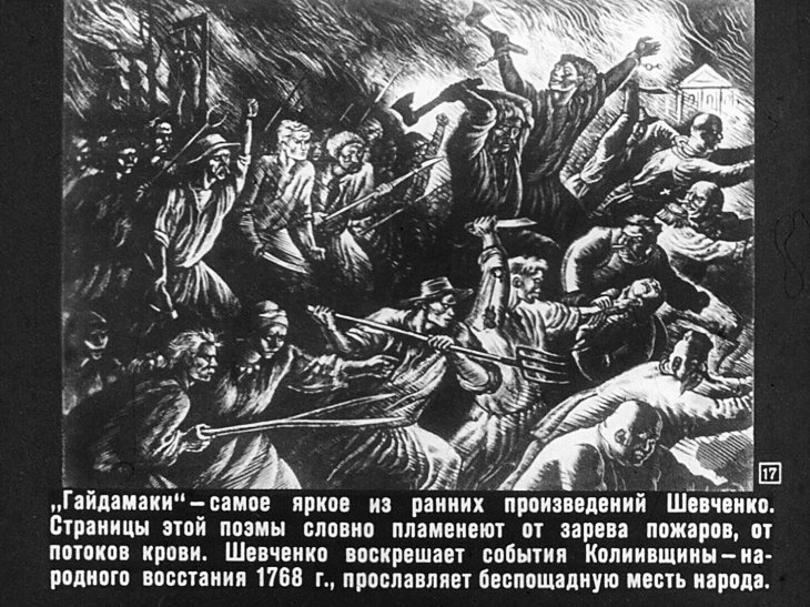 Это заметно, что не знакомы. Фишка в том, что творчество Матраса Пепченко чуть менее, чем полностью состоит из звериной ненависти и чубатого гнидства. И Во время Львовского погрома и Волынской резни хохлы поступали в точности по заветам своего поганого кобзаря. В старших классах малолетние каклы тщательно изучают поэму "Гомомакаки" "Гайдамаки", в которой "Шевченко оспівав і звеличив повсталий народ, його волю до боротьби проти соціального і національного гніту, мужність і душевну красу. Вперше у європейському романтизмі оспівано не героїв-одинаків, а народних месників — «громаду в сіряках»." (поэмка, кстати, говно). В этих романтических виршах есть, например, такие замечательные строки: