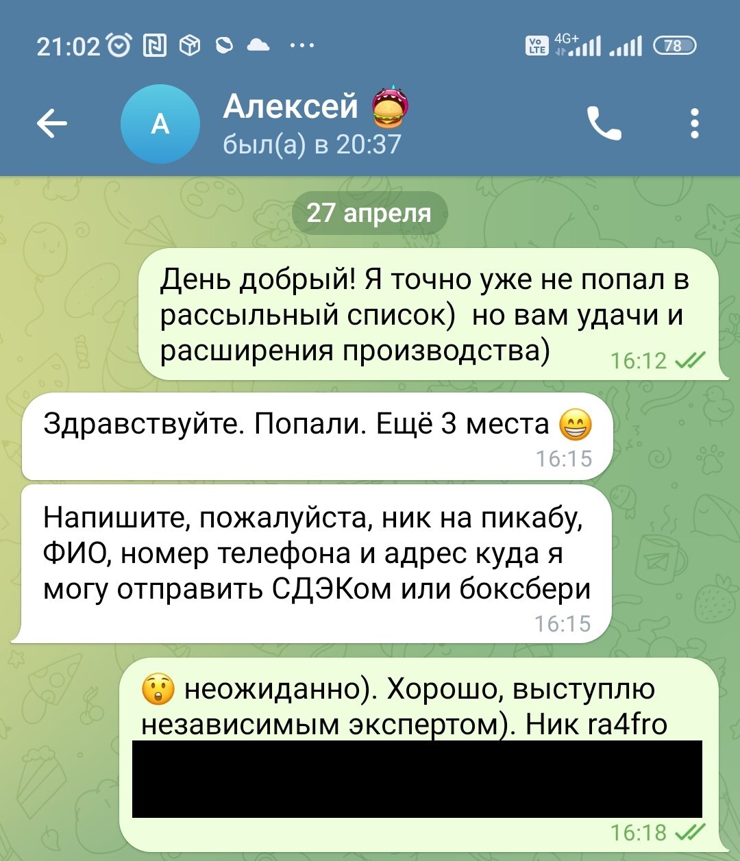 Спасибо Алексею за интересный опыт и вкусный (по настоящему, а не в качестве похвалы за халяву) бонус к ужину. Думаю, при нынешнем уровне качества, Алексей не останется без заказов.