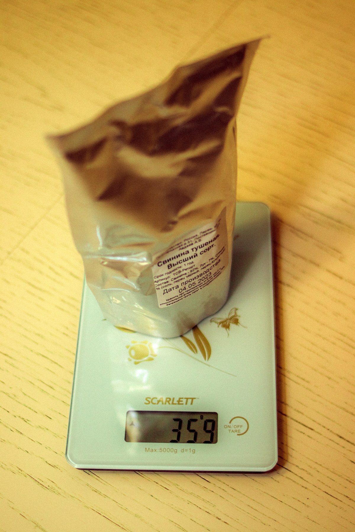 Пакет производит приятное впечатление, прощупываются куски мяса. Взвешивание показало близкие к заявленным данные.
