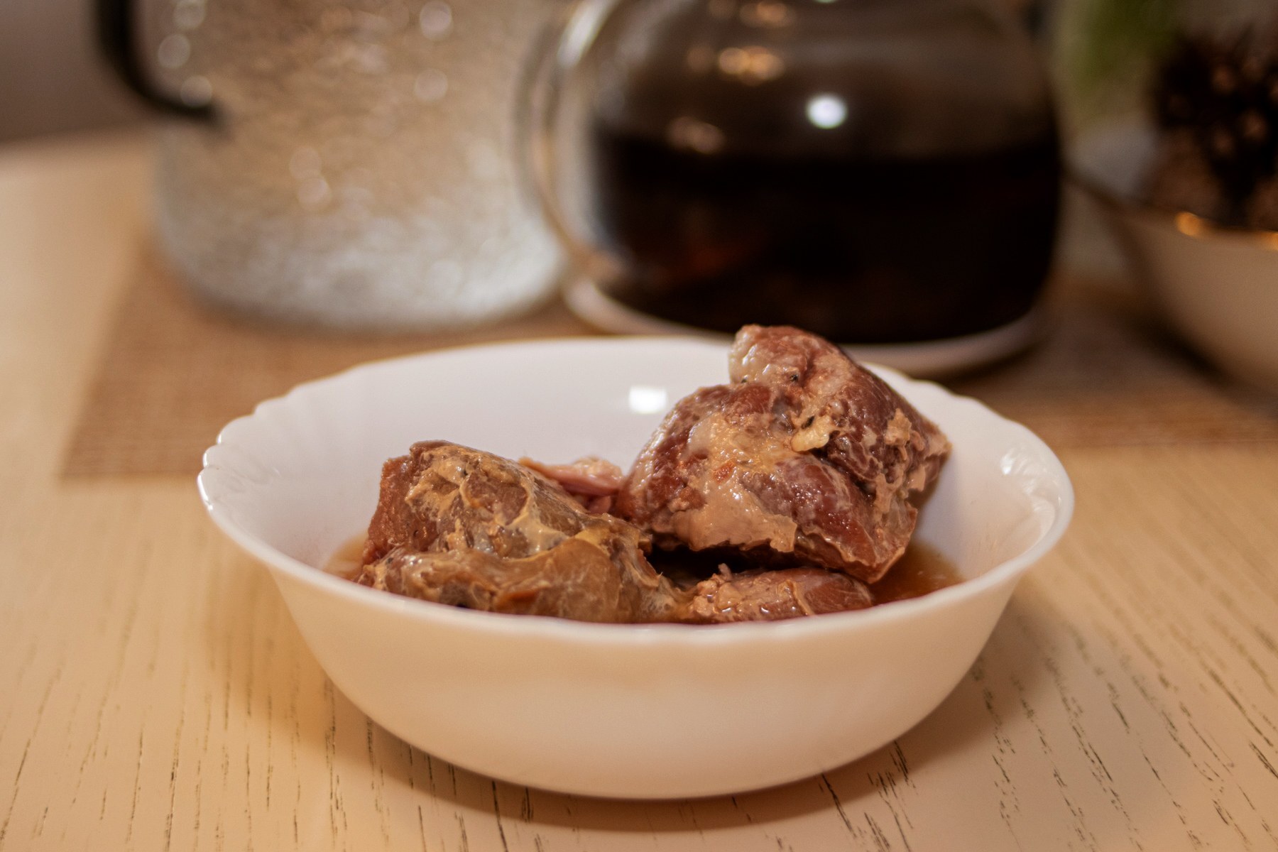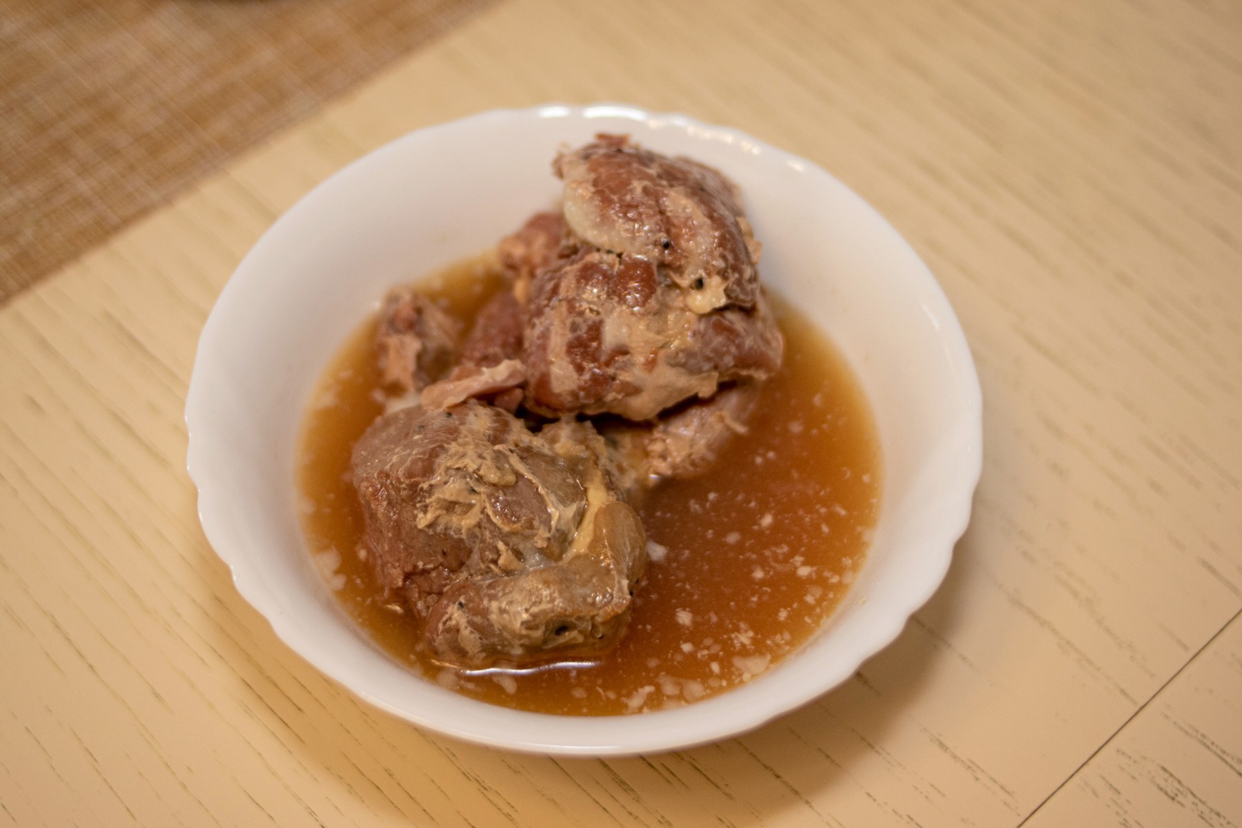 Пакет был безжалостно вскрыт и содержимое придирчиво осмотрено. Пара крупных кусков розоватого мяса, приятный на вид и ароматный бульон. Заметны крупинки специй.