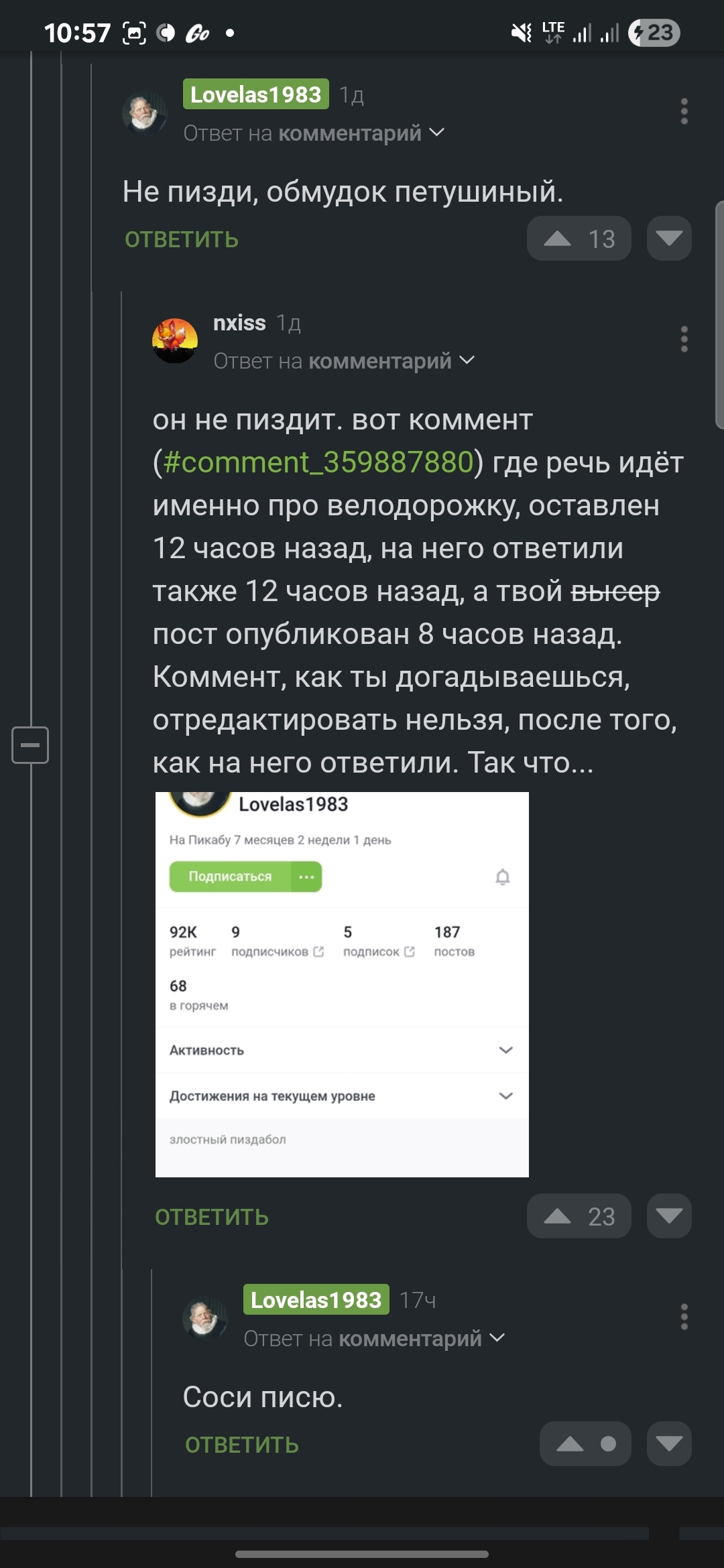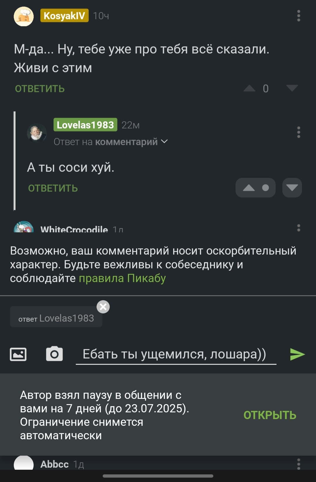 2 KosyakIV Ответ Lovelas1983 в «В Благовещенске ввели полный запрет на электросамокаты»13 6 месяцев назад Ебать ты лошара. Пиздабольная.Ссыкливая) Самокат Запрет Благовещенск Электросамокат Велосипед Волна постов ПДД Велосипедист Самокатчики Штраф Велодорожка Мат Ответ на пост Длиннопост 1 Ещё 0