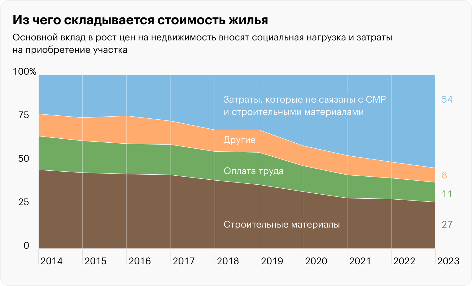 Отмечается, что за последние десять лет существенно выросла доля затрат, не связанных непосредственно со строительно-монтажными работами и стоимостью стройматериалов. На данный момент этот показатель составляет 54% от общей стоимости. Он складывается из ряда факторов: цена земельного участка (до 15% от стоимости продажи 1 кв. м), затраты на подключение здания к коммуникациям (около 10% от цены «квадрата»), проценты по кредитам (около 10% от цены 1 кв. м), реклама (до 7% в структуре затрат), а также социальная нагрузка: при возведении жилого комплекса застройщика могут обязать вместе с жильем построить объекты социальной инфраструктуры (школа, детский сад) или профинансировать ремонт соцобъектов. Эти затраты тоже закладываются в конечную цену жилья. И строительно-монтажные работы — их доля в себестоимости строительства 1 кв. м составляет 30–35%. Эта доля сокращается, десять лет назад она достигала 70–75%.