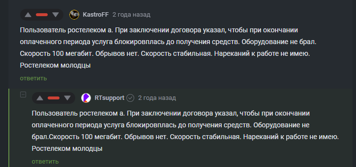 Справедливости ради, это вырвано из контекста. Это ответ на комментарий с точно таким же текстом. Так что акк Ростелекома с очень большой вероятностью просто хотел сделать цитату, но обосрался, запостив коммент раньше времени.