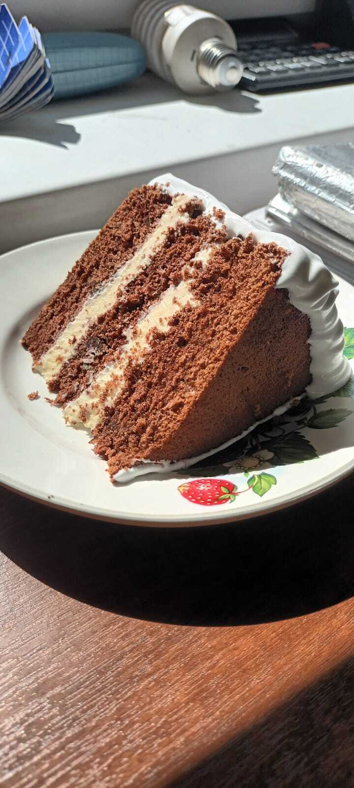 Шифоновый шоколадный бисквит с кремом шалот внутри и снаружи белково-заварным кремом украшен))