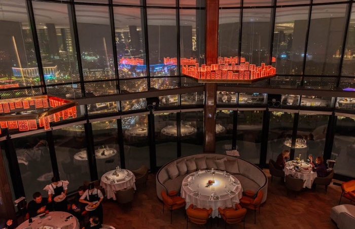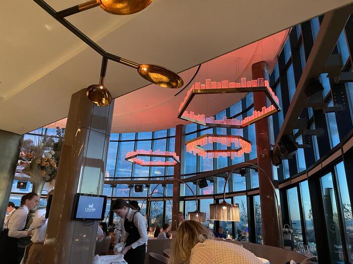 Наступает день "Х", я и жена при полном параде отправляемся в этот ресторан. Я человек от части публичный в силу работы, переживал, а какой же там народ, может даже не пустят на порог и в голове крутился отрывок из фильма с "Квартетом "И" про "сухарик, крутон и дефлопе". Приехав на место, зашли в холл отеля Азимут, поднялись на 22 этаж, при этом около лифта на первом этаже нас проверили по списку. Выйдя из лифта, нас встретили в небольшом помещении с рецепшеном за которым было не менее 10 администраторов (В ресторане настоящий муравейник из персонала) на самом видном месте стояла та самая награда.