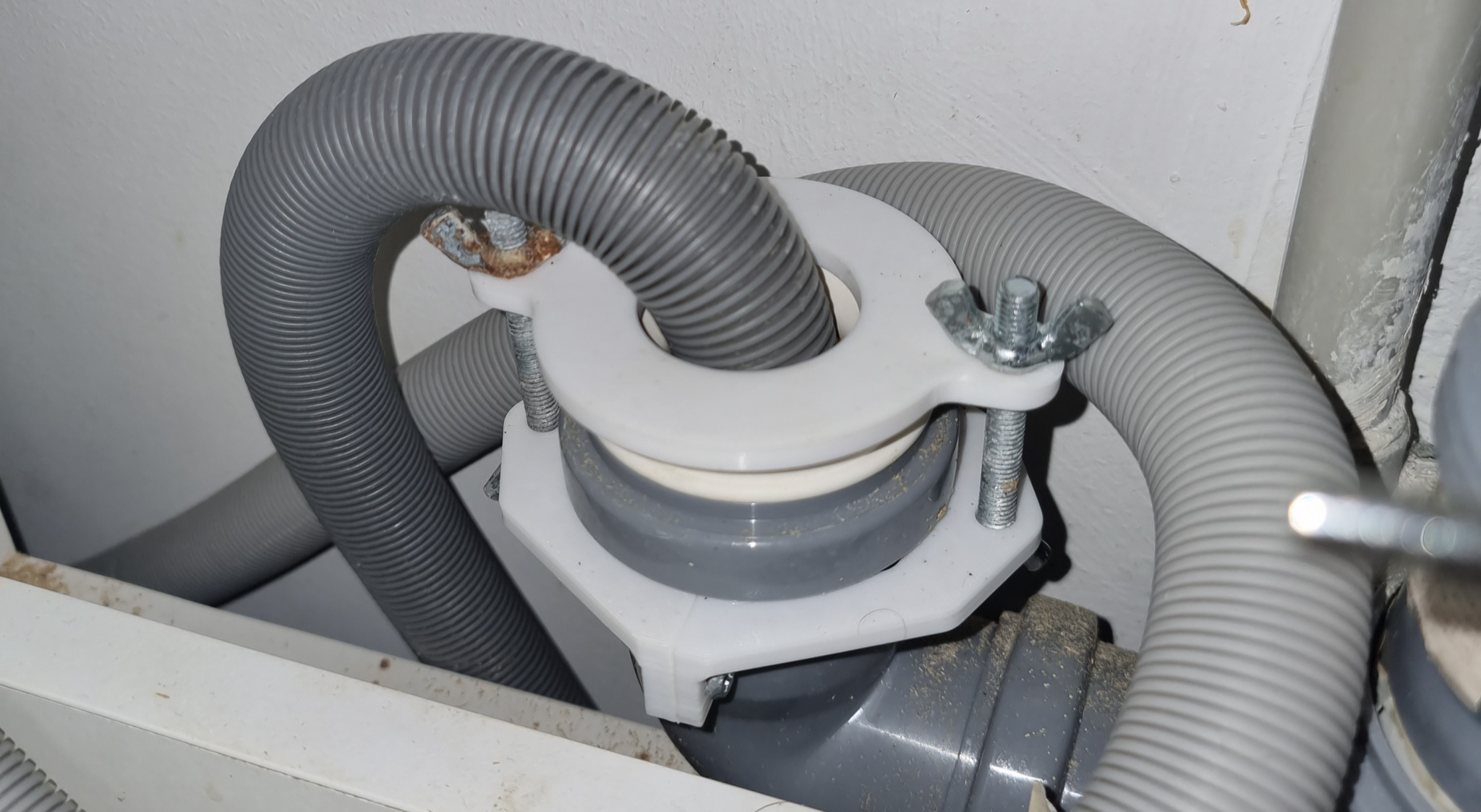 Дополнительное крепление для сливного шланга посудомоечной машины. Шланг однажды вырвало и вода была полу, но обошлось. Крепёж периодически меняю