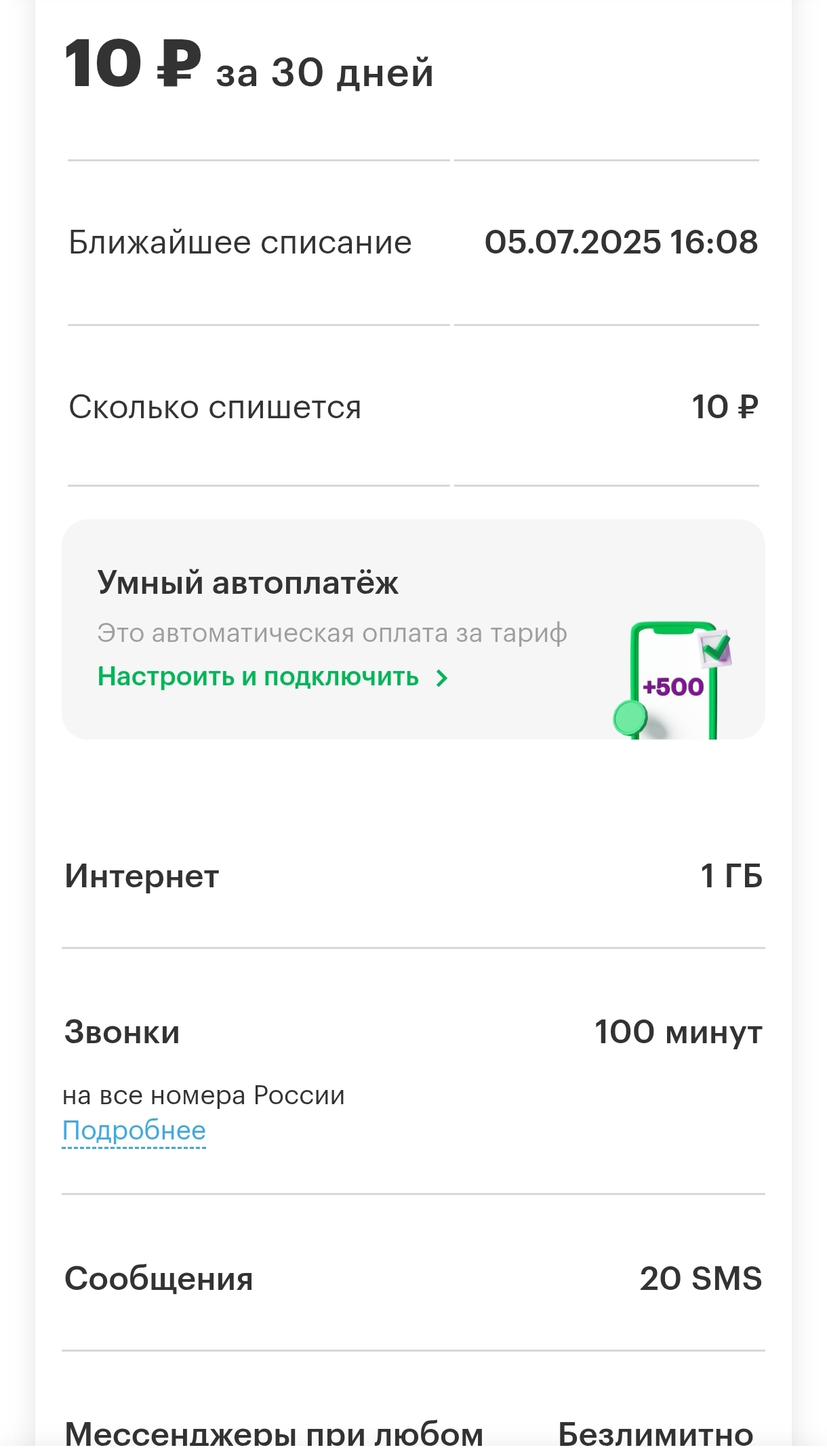 Если вы про мегафон, то такой тариф за 10р/мес сейчас есть. Я недавно на него перескочил. 100 минут на все номера по России, 20 смс и с бесплатными плюшками: от 6 до 11гб/мес плюс основные все мессенджеры, соцсети, ютуб, рутуб бесплатно. Можно платную опцию подключить - 50 гб на 30 дней за 100 руб. Причем, можно сколько угодно сразу активировать - снимут по 100р за каждую активацию и плюсовать будут по 50Гб соответственно. Когда 30 дней те истекут, то автоматом снова 50Гб накинется, сжигая непотраченные гиги, но уже по 200р. Либо просто отключаешь эту услугу и всё. Я так пользуюсь в поездках по России этим, если моя основная старая симка билайновская в телефоне (двухсимочном) вне зоны мобильного инета Билайн на долгое время активировал 50Гб за 100р на 30 дней и ваще не парюсь по поводу расхода трафика. Когда больше не нужно, отключил и всё, снова 10р/мес со всеми вышеперечисленными бесплатными плюхами.