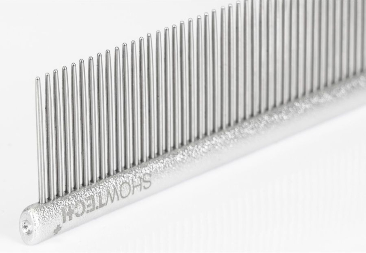 На фото достаточно дорогой профессиональный гребень, но вполне годные есть и на алике. Главный принцип — чем острее зубцы, тем лучше они чешут. Лучше всего взять гребень с разным шагом зубцов: с одного конца редкие, с другой частые. Когда редкий гребень проходит по шерсти без усилия — она приемлемо прочесана.