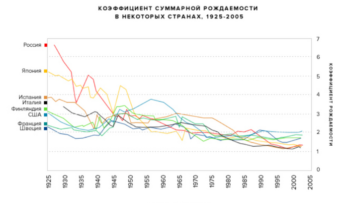 Население росло по миллиону в год? Ну да, грубо говоря, весь период - по миллиону в год. Только вот прирост населения падал, потому что миллион относительно 120 миллионов в 20-ых и миллион относительно 200 миллионов в 1988 - это две большие разницы, как говорят в Одессе.. И, о ужас, ниже уровня самовоспроизводства населения СССР ушел еще в 63 году. И нынешняя демографическая яма - прямое следствие падения рождаемости в СССР (как по объективным причинам типа дем. перехода, так и по субъективным), дополнительно усугубленная 90-ыми. Не будь 90-ых, СССР бы все равно пришел к тем же проблемам, но чуть позже, что сейчас отлично демонстрирует КНР, где 3-ий год подряд сокращение населения.