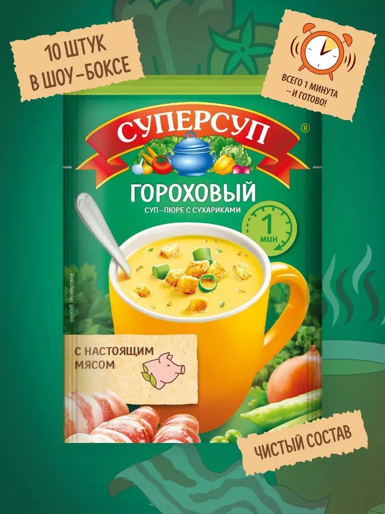 Состав: горох хлопья нтв, копчёность, бульон говяжий, мука пшеничная, соль, морковь сушеная, соевое масло, лук сушеный , зелень сушеная, аромат "Бекон", аромат "Копченость", куркума, перец черный молотый