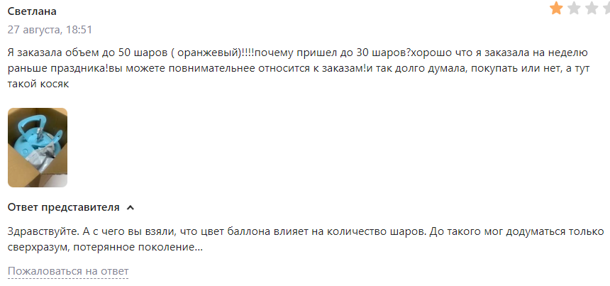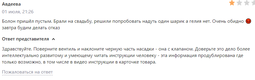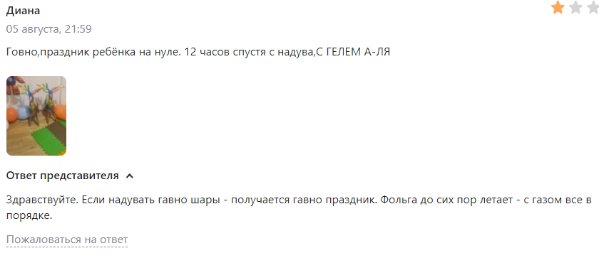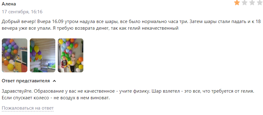 545 justkit Маркетплейсы Ответ на пост «Академия здоровья - крайне вежливая компания»1 2 года назад Наткнулся тут на магазин, торгующий гелием в баллонах, делюсь ответами на отзывы. Отзыв Хамство Длиннопост Скриншот Маркетплейс Ответ на пост 21 4 4 1 Ещё 0