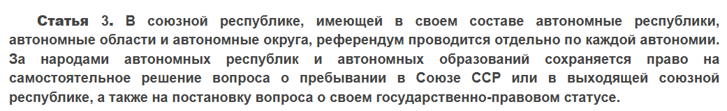 афтр, при распаде СССР нарушена статья 3 Закона СССР 1990 года N 1410-I «О порядке решения вопросов, связанных с выходом союзной республики из СССР», согласно которой, в Крымской АССР должны были провести отдельный референдум по вопросу её пребывании в составе СССР или в выходящей союзной республике — Украинской ССР или на постановку вопроса о своем государственно-правовом статусе. Однако хохлы, автоматом включили на тот момент, АВТОНОМНЫЙ Крым в состав Украинской ССР. Вот, тогда и надо было делать "Крым НАШ" и всё бы было абсолютно ЗАКОННО и никто бы НЕ ВЯКАЛ!! Но, алкаш ельцин всё проебал!!!