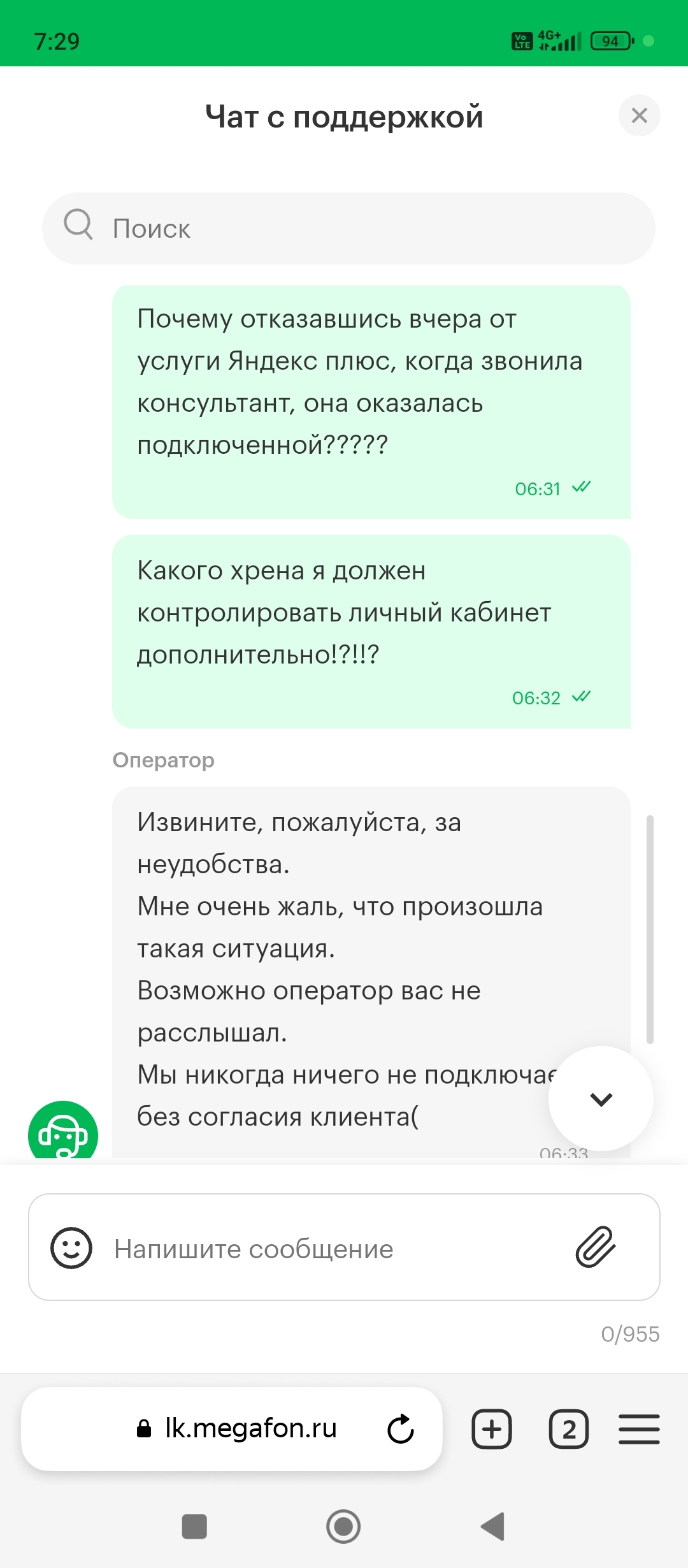 Вчера,утром вкусив пива в 7 утра,прилетела мысль - поверить личный кабинет. Захожу - на бля!!! Подписка оформлена!!! Охуенно. Захожу в настройки,отписываюсь. И тут же пишу в поддержку. Поддержка естественно отморозилась. А если бы я не поверил свой личный кабинет??? Тут же проверил подписки своих родителей. Мегафон,вы пидорасы!!!! Вот у нас в районе (где родители живут)ловит только ваша связь. Гандоны вы