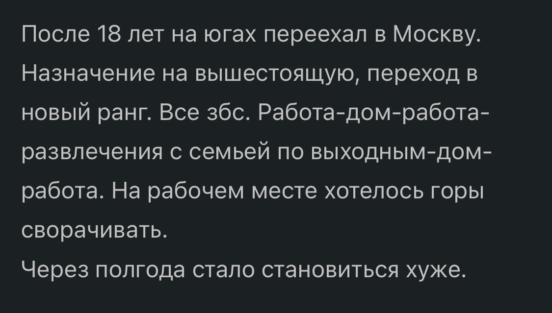 После 18 лет на югах переехал в Москву. Назначение на вышестоящую, переход в новый ранг. Все збс. Работа-дом-работа-развлечения с семьей по выходным-дом-работа. На рабочем месте хотелось горы сворачивать.