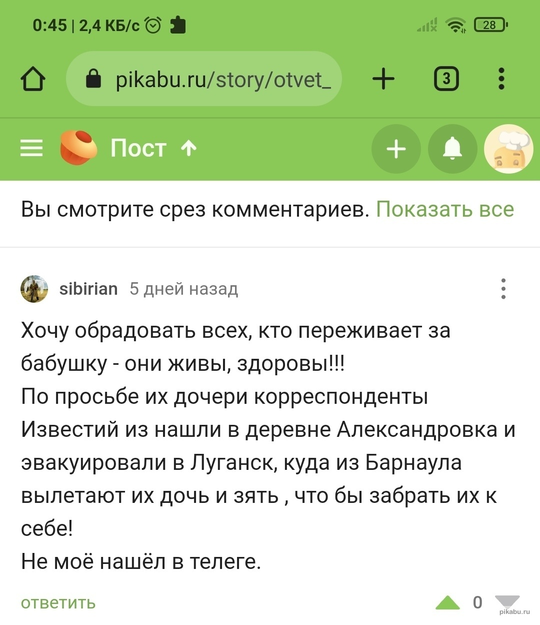 Очень сомнительная информация. Первый раз про то, что бабушка едет в Барнаул я прочитала тут в комментариях еще 18 дней назад, см скрин ниже (он сделан раньше, поэтому кол-во дней другое)
