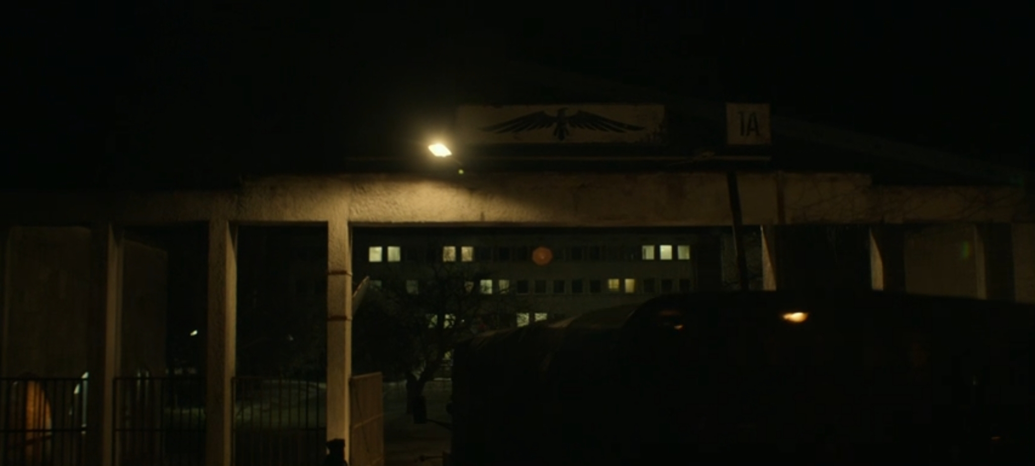 Это не Советская архитектура. В те времена не было Дизайна, а именно архитектура. А это дизайнерская, вывеска, со стилизованными буквами. Ладно, это я как дизайнер с опытом просто докапался... Но дальше, въезд в некий секретный НИИ. Обращаем внимание на нарисованную "птичку" над воротами.