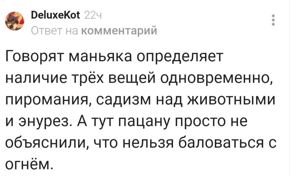 В детстве страдал неебическим влечением поджигать всё, абсолютно всё... 2 раза жёг дом, папу еле вытащили, мне на тот момент 3 года. Куда бы мы не собирались в гости, родители предварительно звонили и в шутливой форме просили спрятать все спички и зажигалки и вообще всё, чем можно добыть огонь... И как бы меня не пиздили, я всё равно шёл поджигать мамин халат, соседский дом, покрывало, тюль, чашки пластиковые... ЖИВОТНЫХ ПРАВДА НЕ МУЧАЛ... Я их боюсь 🤣