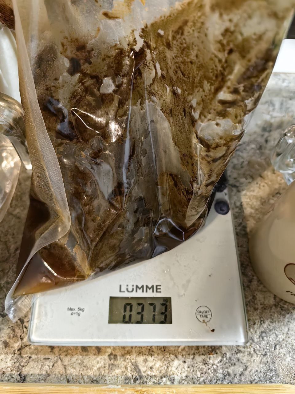 В итоге было решено сразу же перекидывать его в духовку на ужин, поэтому мясо продолжило лежать и отдыхать при температуре 68 градусов ещё 3 часа, а я к этому времени разогрел духовку (у меня обычная газовая в плите, выставил её на 250 градусов). Вот что я извлек из пакета: