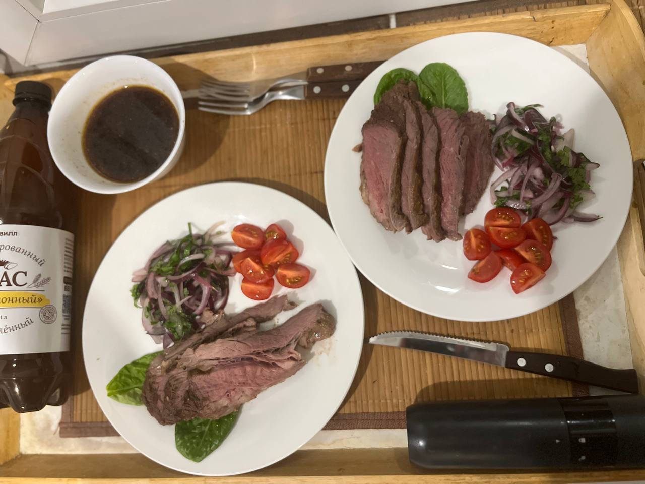 Да, разумеется, что это не брискет и не сувид. Однако как вариант реанимации достаточно жёсткого и жилистого мяса — топчик. Говядина получилась нежной, сочной, ароматной и распадающейся на волокна. Единственное, что я б её в следующий раз держала не 3 часа, а все 5, потому что в районе жилы (которая прям по центру куска на левой тарелке) оно всё-таки было жестковато. Но в целом эксперимент считаю успешным.