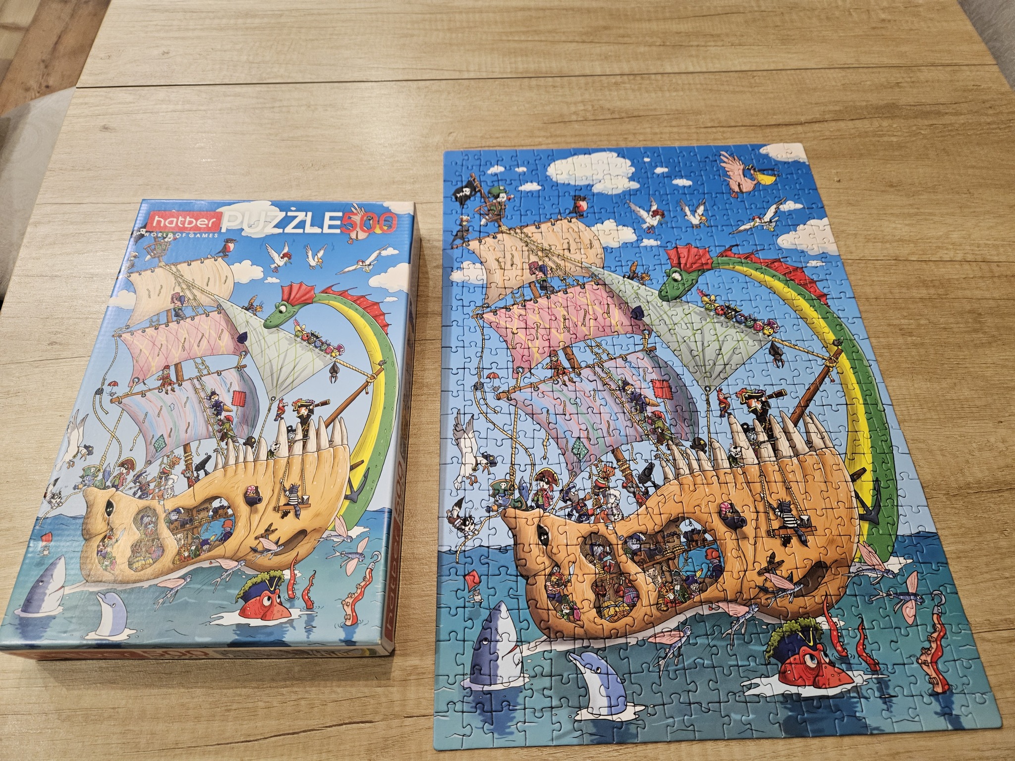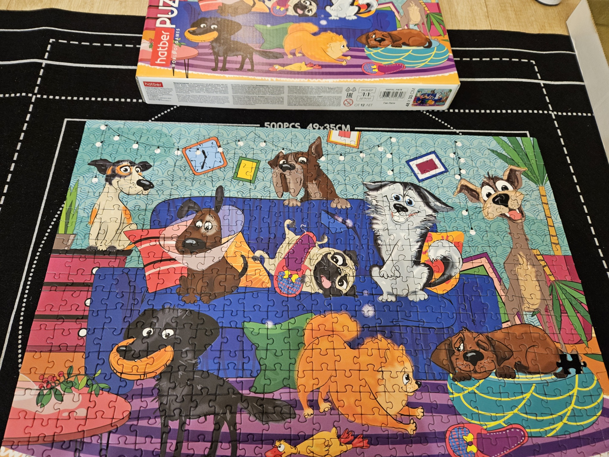 Так как у нас супругой не было опыта сбора пазлов такого масштаба предварительно приобрел пазлы поменьше на 500 элементов, их собрали, фото ниже. После чего был приобретен коврик, на отдельную доску себя не уговорил.