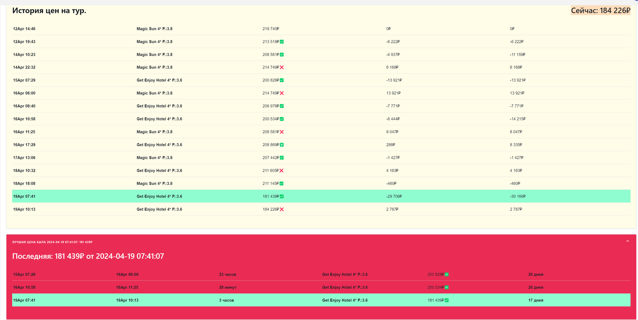 Вот поэтому лично мне комфортнее отдыхать загранкой. Но для экономии - я сделал отслеживания цен, с помощью бота. Например сегодня с утра на майские праздники цена тура упала на 30.000, для путешествия на троих на 12 дней в 4* - норм. Но можно еще половить.