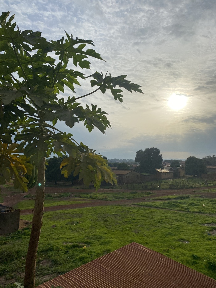 Рассвет, вид с балкона 2 этажа на восточную сторону, дерево во дворе это папайя.
