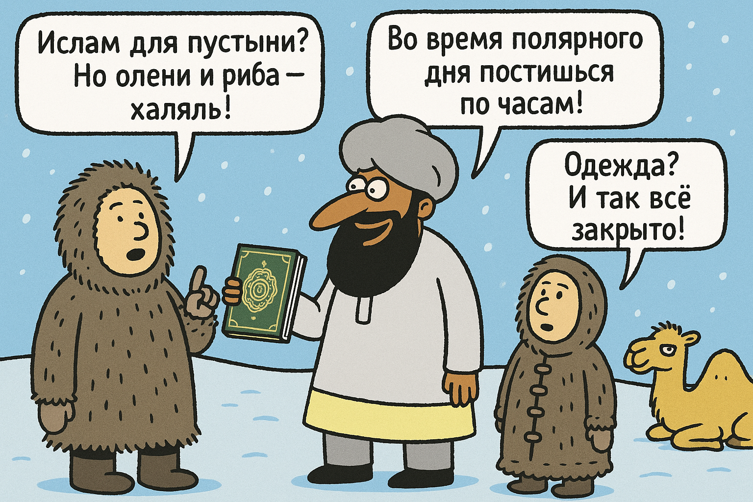 Эй, ну серьёзно. В исламе больше миллиарда человек, включая тех, кто в жизни не видел верблюда, но каждый день видит -40°C. Якутия, Камчатка, Мурманск — мусульмане там есть и живут себе спокойно. Не летают в Мекку на оленях, не переживайте.