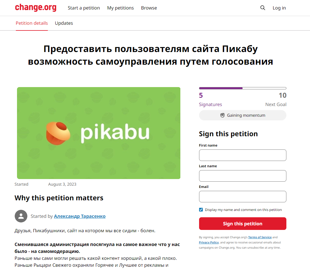 Пипец, что происходит. Одни бунтуют, другие покидают сайт, третьи делают свой пикабу, этот вот петицию на Пикабу пишет, другой вообще через чейнчжорг требует от пикабу народовластия... Ощущение, что народ решил вместо того что-бы в своей жизни что-то менять, заниматься этим понарошку на Пикабу. Скоро видимо и временное правительство Пикабу замутит кто то, а часть убегших на другие ресурсы, станут "Пикабушниками в иммиграции" и будут плакать вспоминая как раньше можно было обнять березку и посылать всех нахуй.