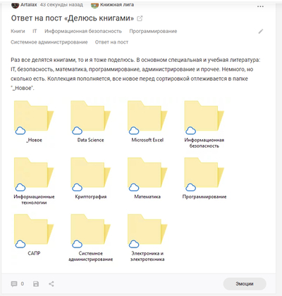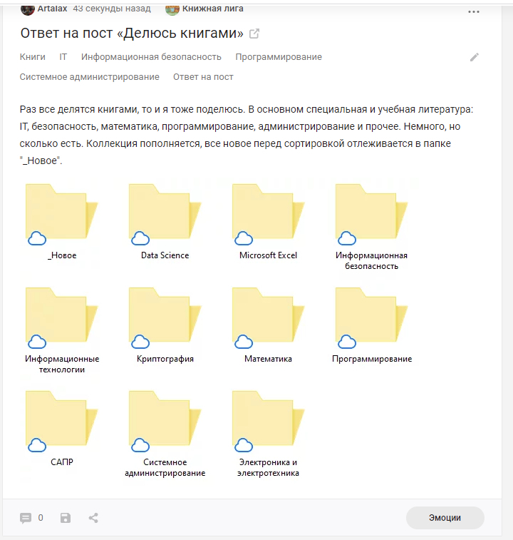Раз все делятся книгами, то и я тоже поделюсь. В основном специальная и учебная литература: IT, безопасность, математика, программирование, администрирование и прочее. Немного, но сколько есть. Коллекция пополняется, все новое перед сортировкой отлеживается в папке "_Новое".
