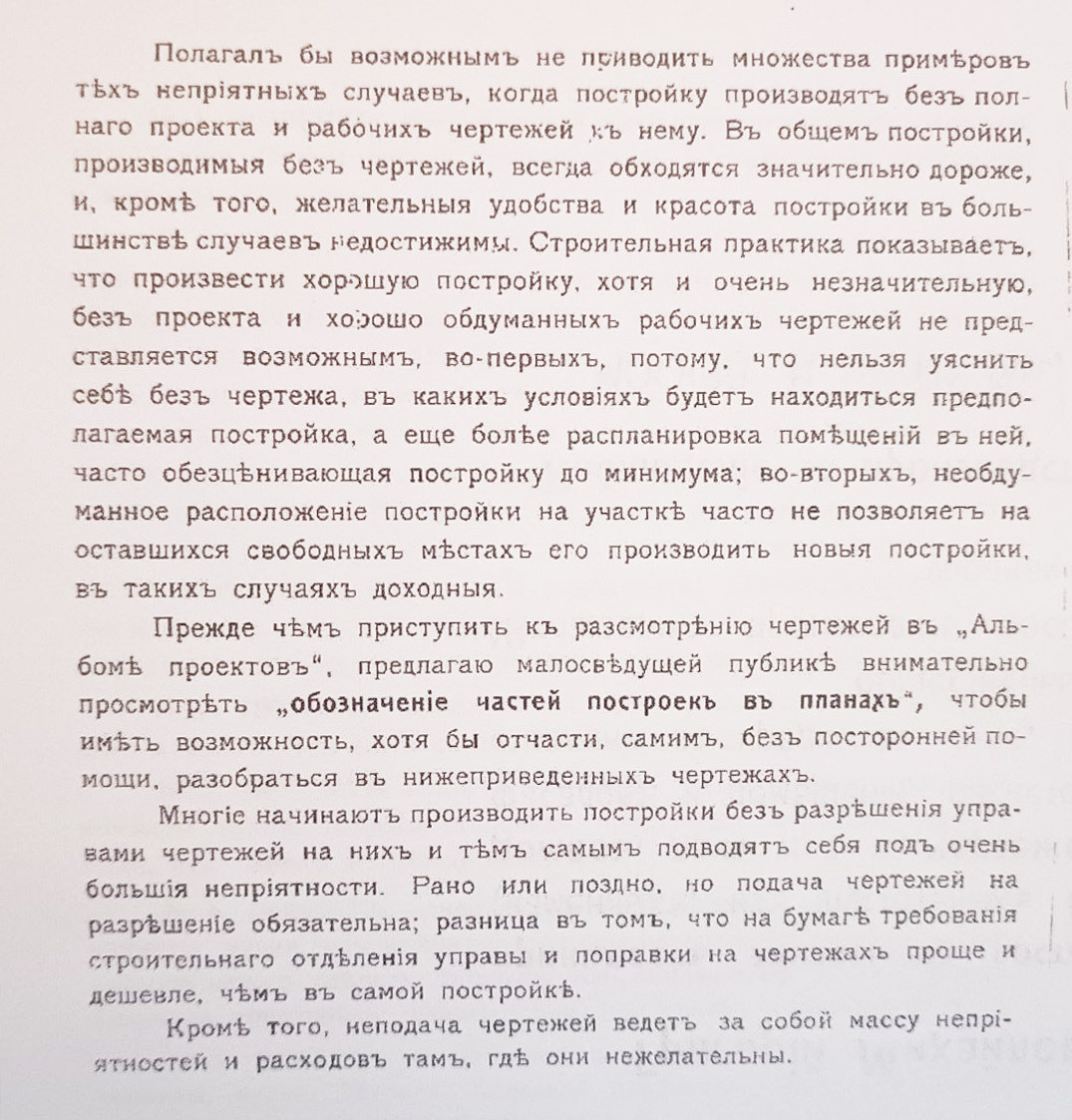 Полагал бы возможным не приводить множества примеров тех неприятных случаев, когда постройку производят без полного проекта и рабочих чертежей к нему. В общем постройки, производимые без чертежей, всегда обходятся значительно дороже, и, кроме того, желательные удобства и красота постройки в большинстве случаев недостижимы. Строительная практика показывает, что произвести хорошую постройку, хотя и очень незначительную, без проекта и хорошо обдуманных рабочих чертежей не представляется возможным, во-первых, потому, что нельзя уяснить себе без чертежа, в каких условиях будет находиться предполагаемая постройка, а ещё более распланировка помещений в ней, часто обесценивающая постройку до минимума; во-вторых, необдуманное расположение постройки на участке часто не позволяет на оставшихся свободных местах его производить новые постройки, в таких случаях доходные.<...>