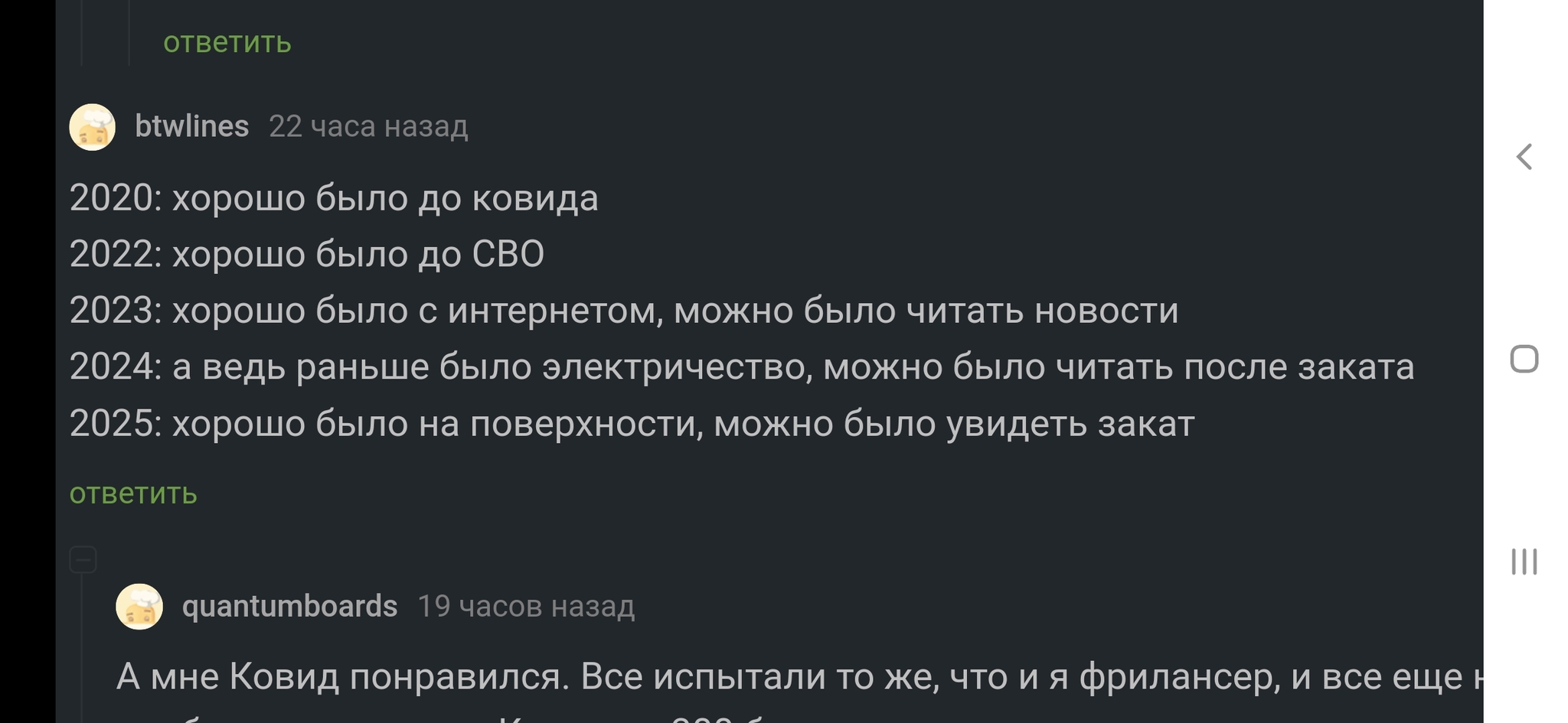 K555OT Ответ на пост «Действительно»3 3 года назад #comment_250251764 Мобилизация Коронавирус Актуальное Грустный юмор Ответ на пост Скриншот Комментарии на Пикабу 1 Ещё 0