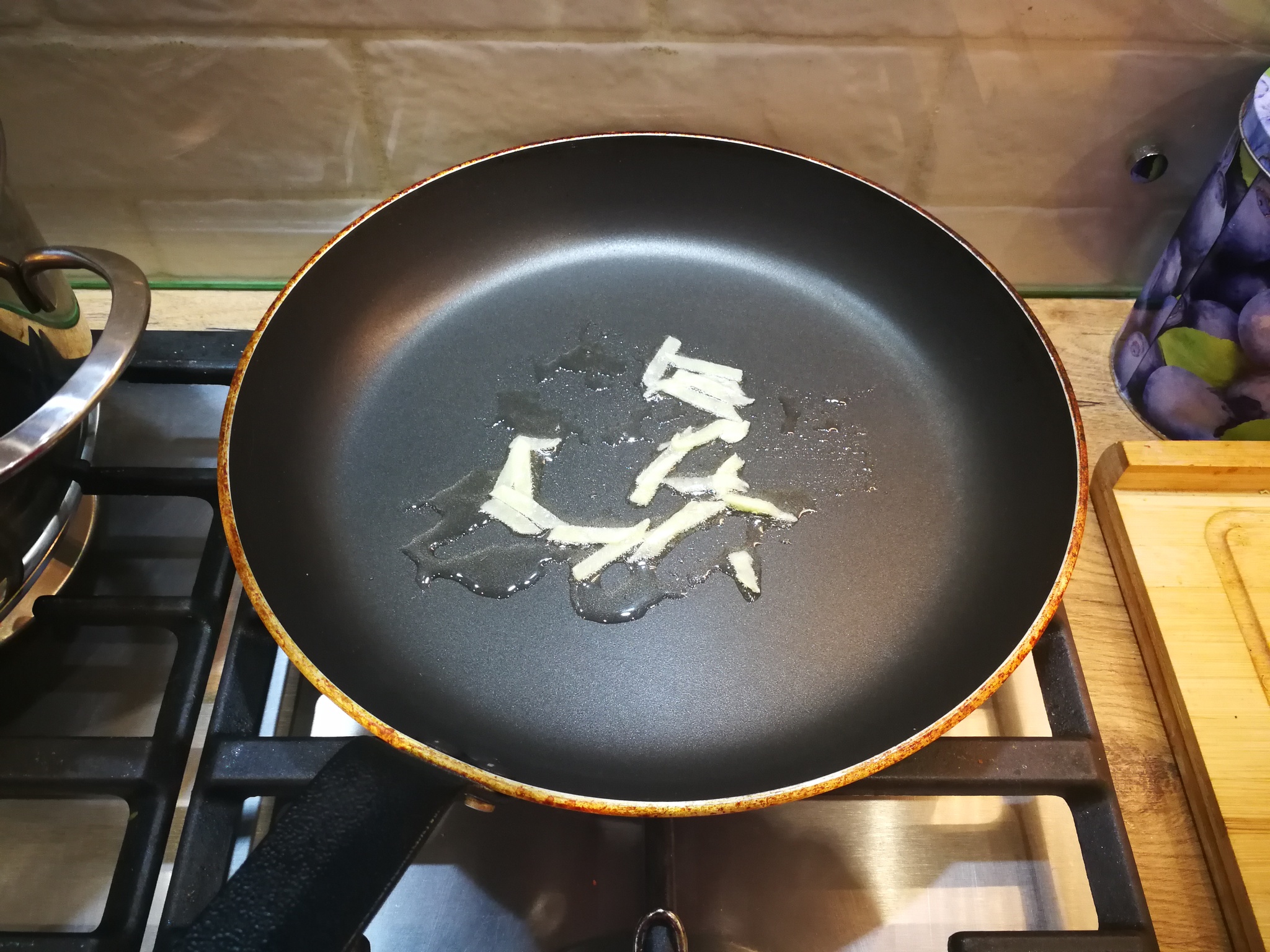 Для начала на не сильно разогретом масле немного обжариваем имбирь (хотелось бы ещё чеснок, но его не оказалось), имбирь надо немного прогреть что бы пошёл аромат, не надо его жарить долго.