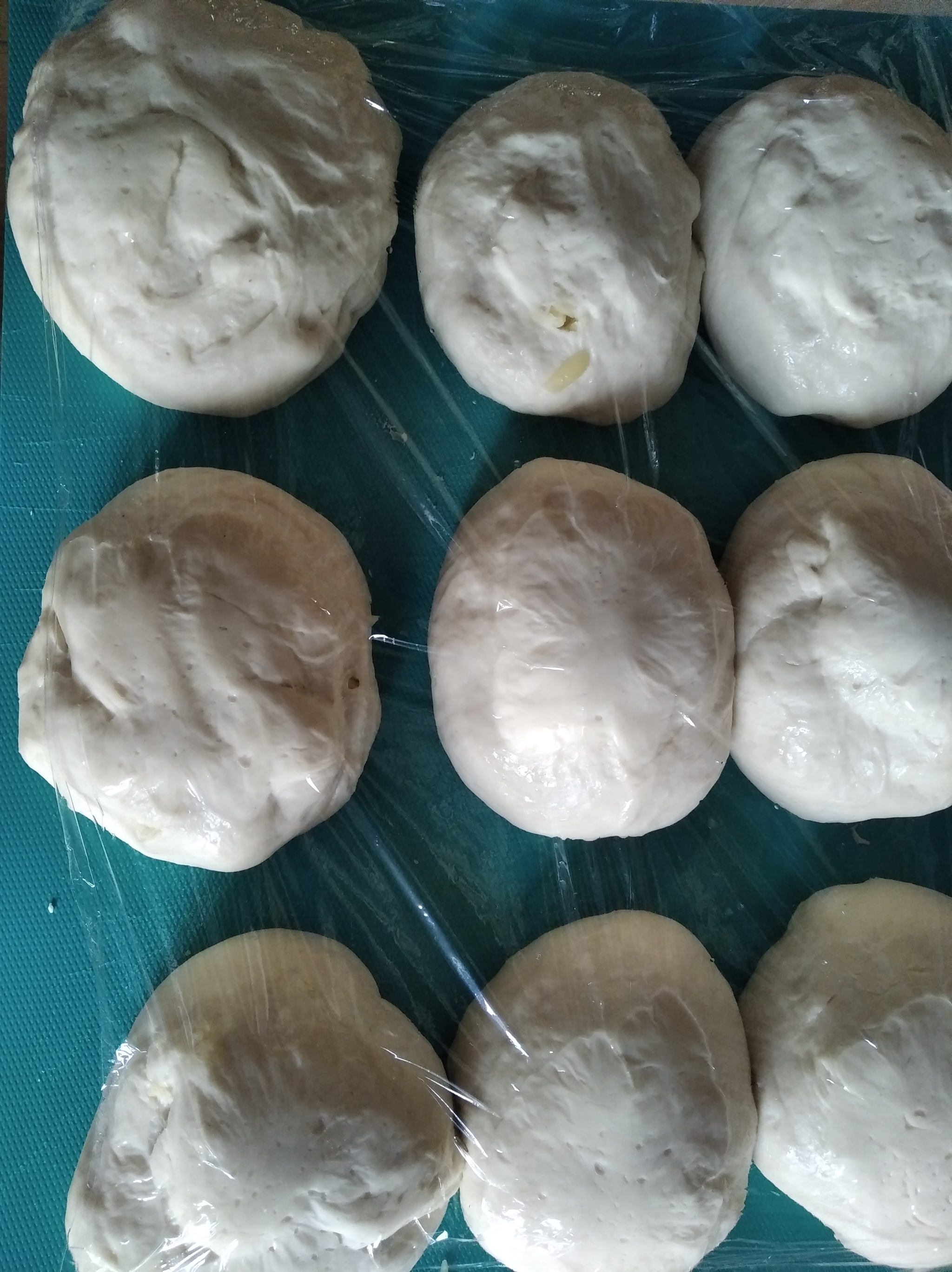 После того, как тесто поднялось, сформировал девять "колобков", растянул лепешки, разогрел духовку на 270°C и выкладывал лепёшки по три за раз на противень. Готовится те же пять минут.