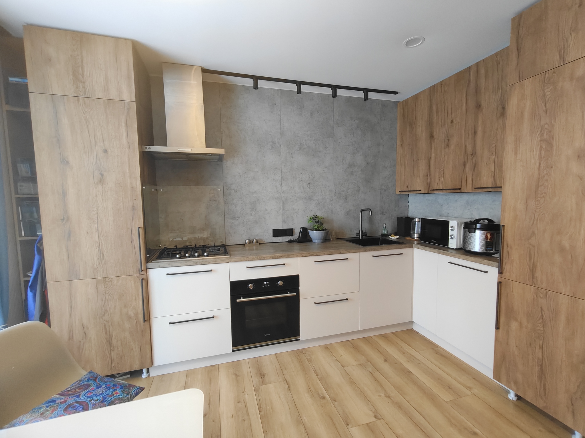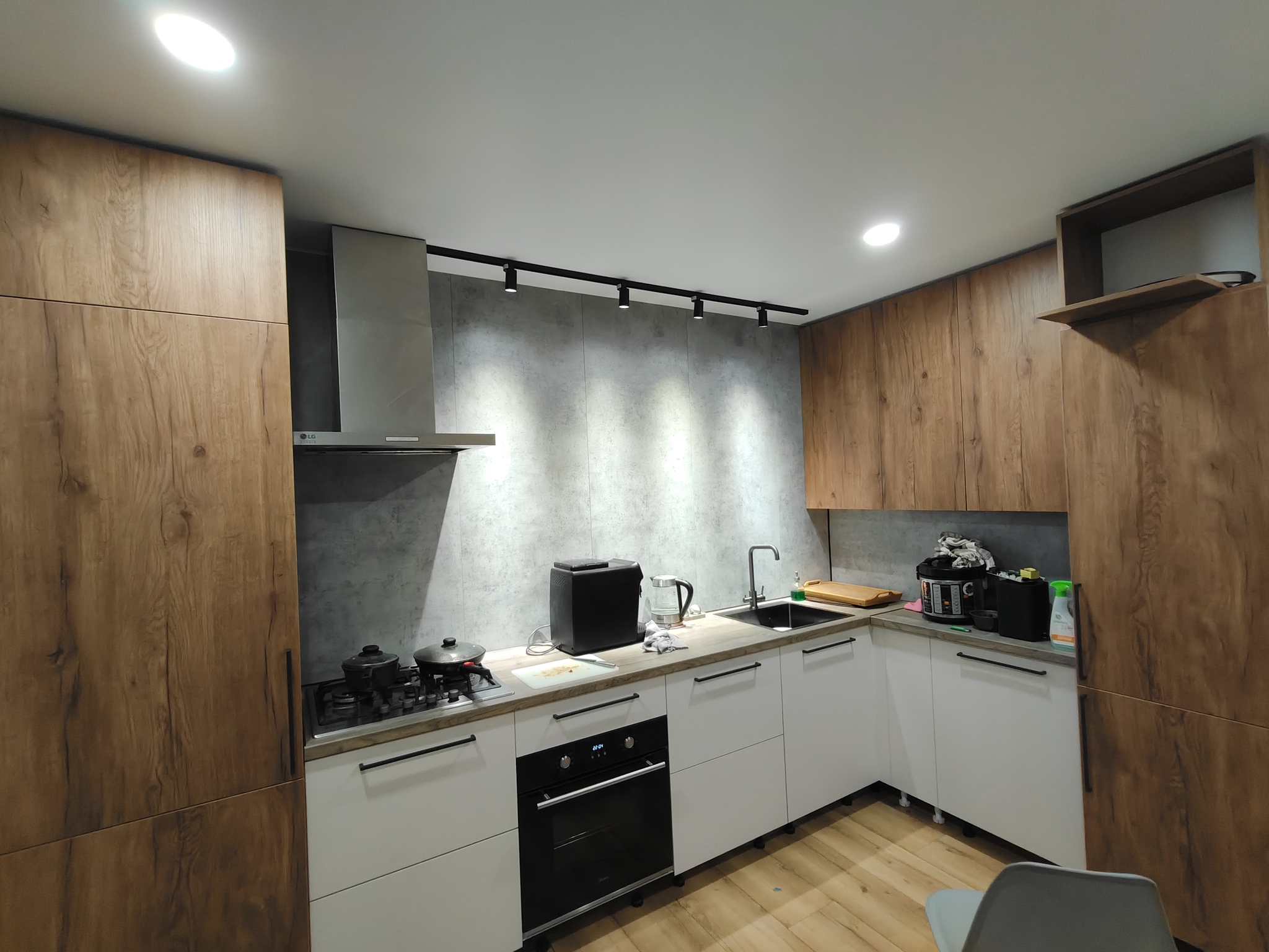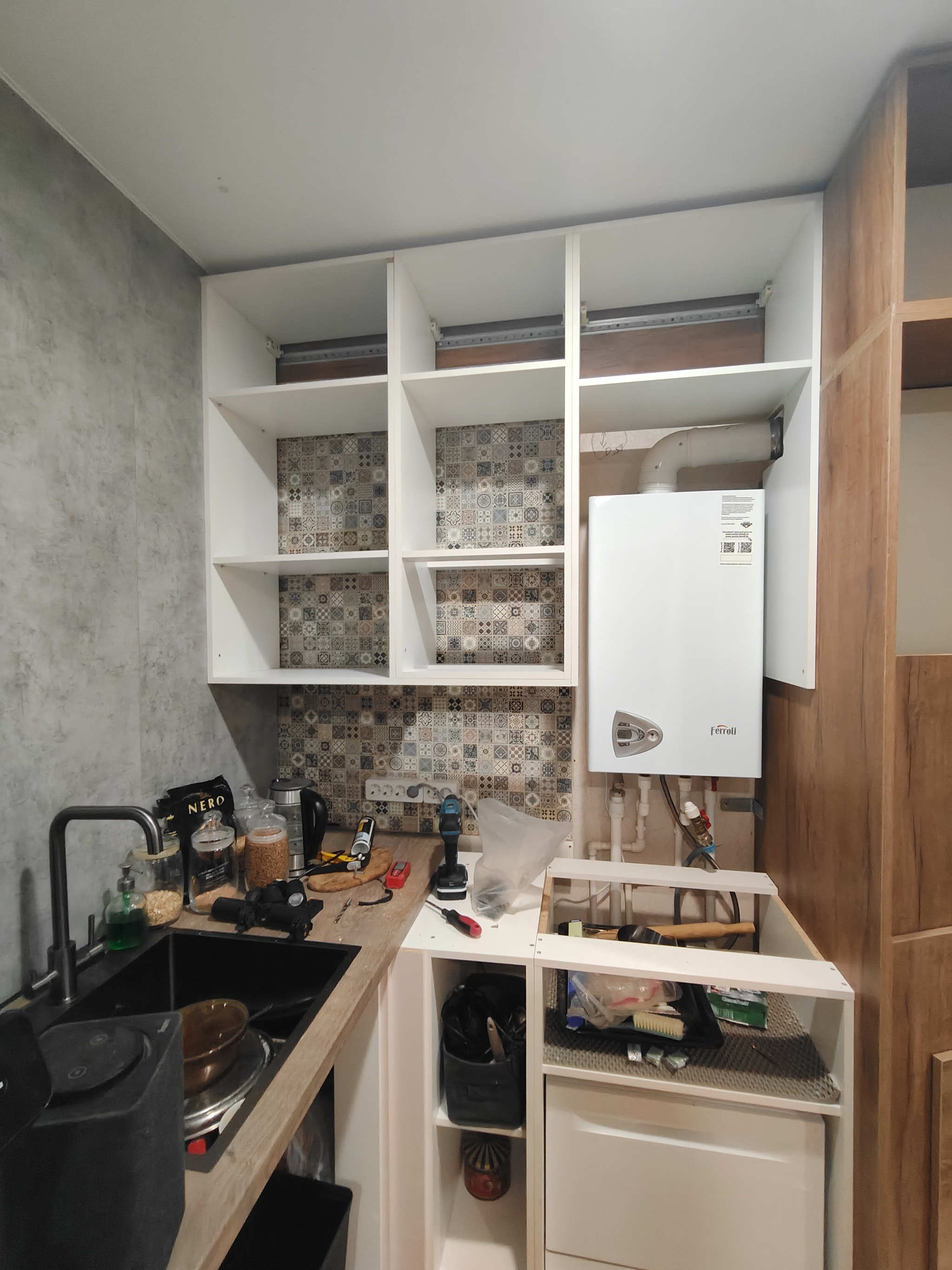 * На короткой стороне кухни под навесными шкафами стоит ЛДСП в цвет фартука он съёмный для доступа с котлу и розеткам. На самой же столешке стоит повседневная техника, разгружая рабочую зону.