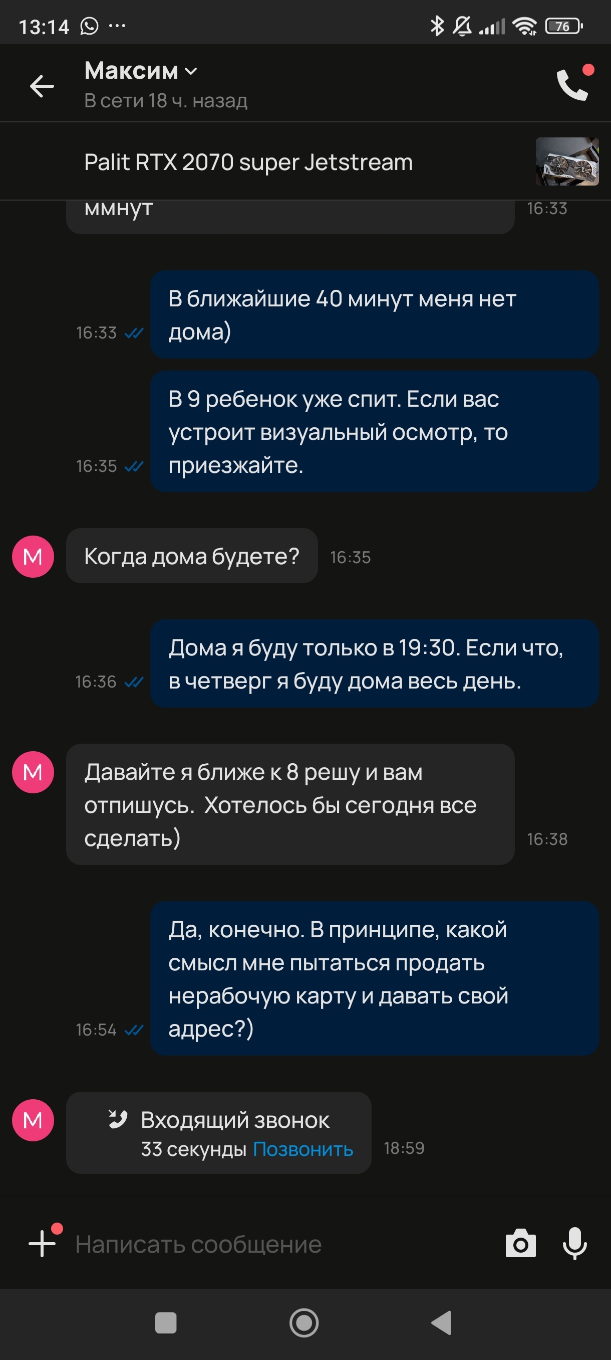 Продавал недавно старую видеокарту. Написал один покупатель, что хочет приехать либо в 17 часов, либо к 9 вечера. Я объяснил ему, что вечером к меня ребенок спит и я не смогу подключить карту к компьютеру, так что в это время можно только по визуальному осмотру. Как вариант предложил ему приехать когда я буду дома в один из будних дней, либо в выходные. Он написал, что подумает.