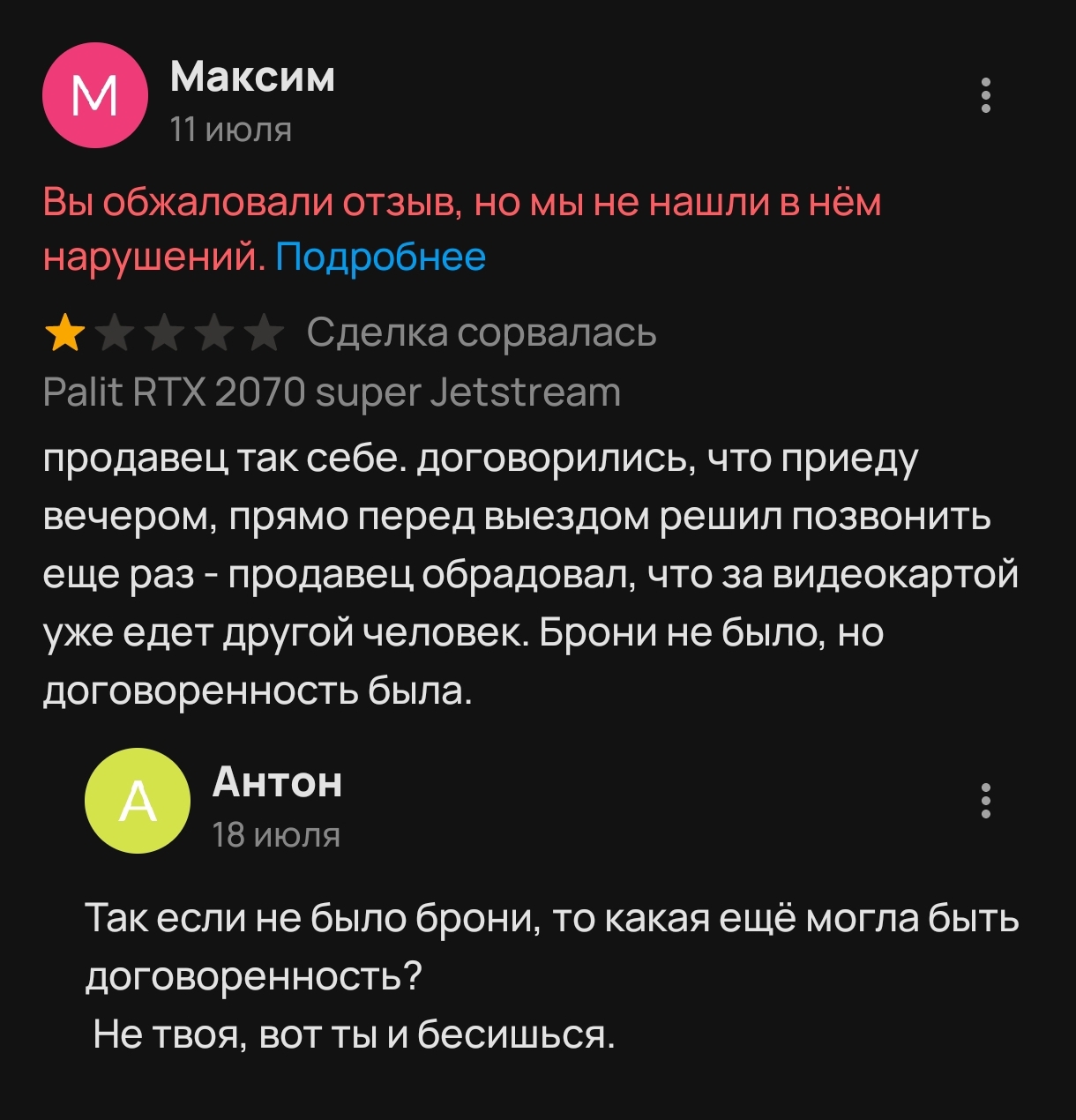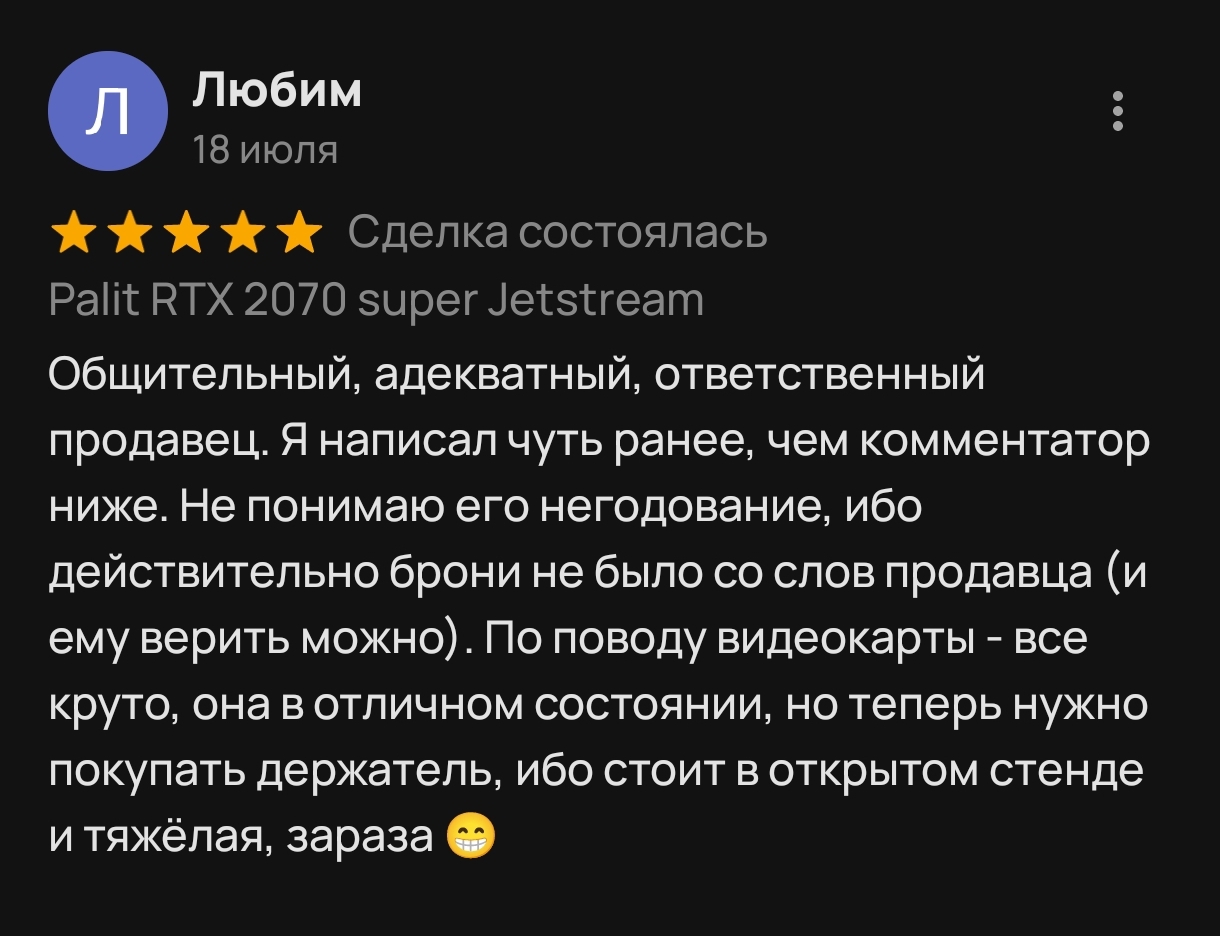 Пока этот покупатель думал, позвонил другой и сказал, что готов приехать и забрать с визуальным осмотром. Естественно, мы с ним и договорились о продаже. Через некоторое мне решил таки позвонить первый покупатель, которому я сообщил, что за картой уже едет другой. Второй покупатель приехал и купил карту. А через некоторое время мне прилетел отзыв от первого, ещё и с оценкой, сука.