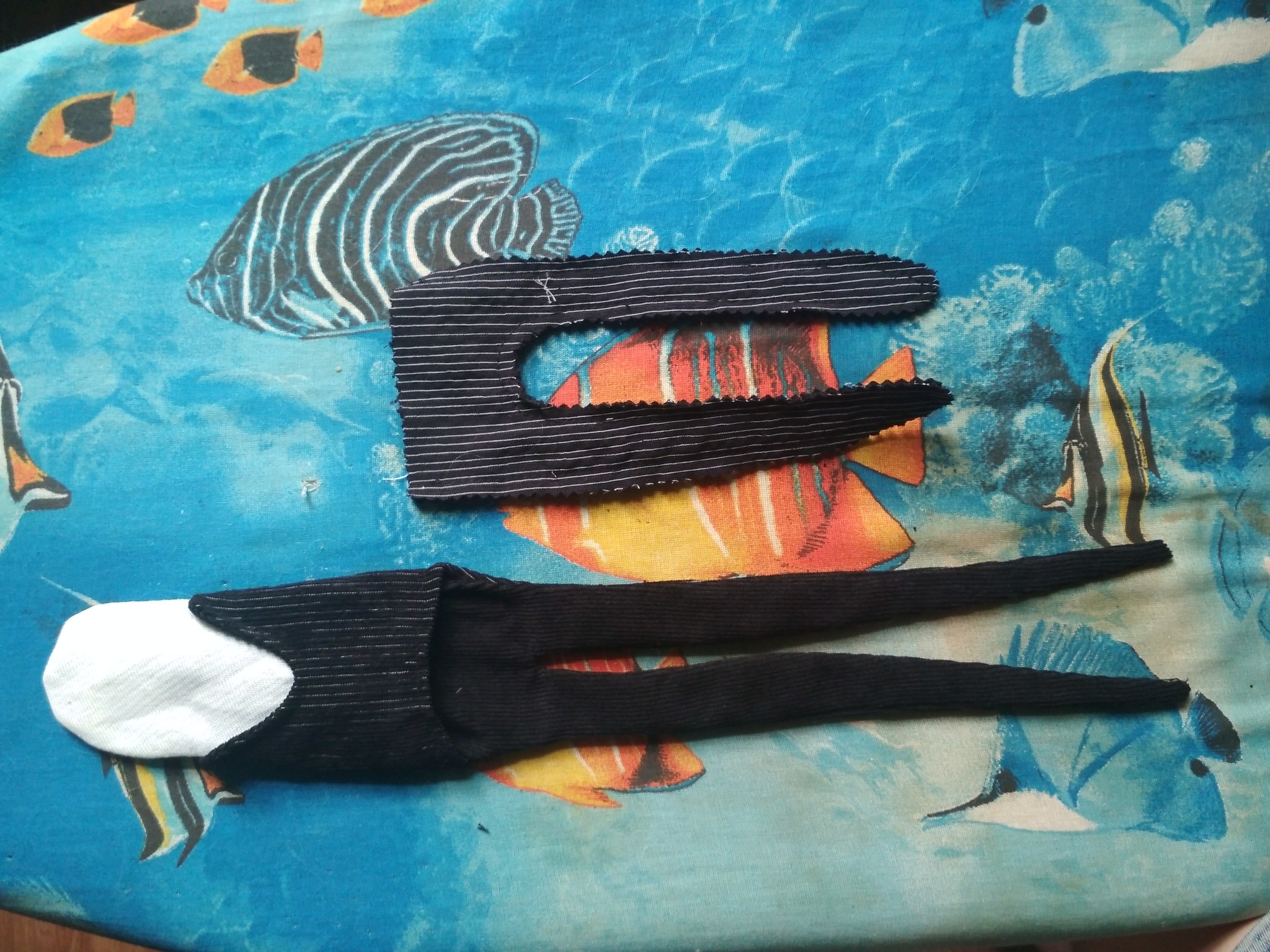 Шапка - тоже моя работа. Высота в итоге примерно 30 см, в плоском виде около 50 см. И пара фоток процесса. Полоски на штанах и фраке - светлые швы на вельвете, потому что ткани в тонкую полоску в магазине вообще не было.